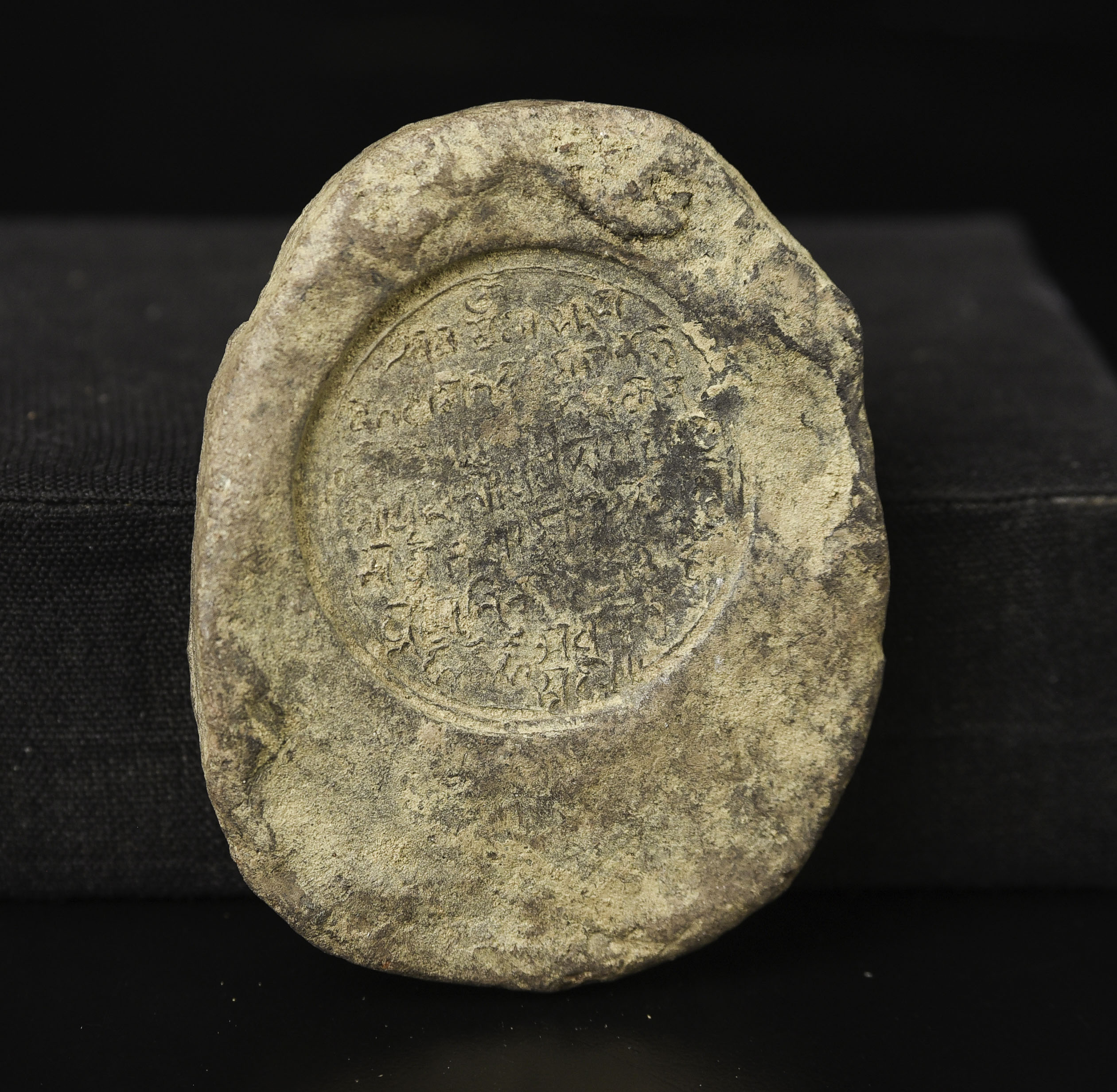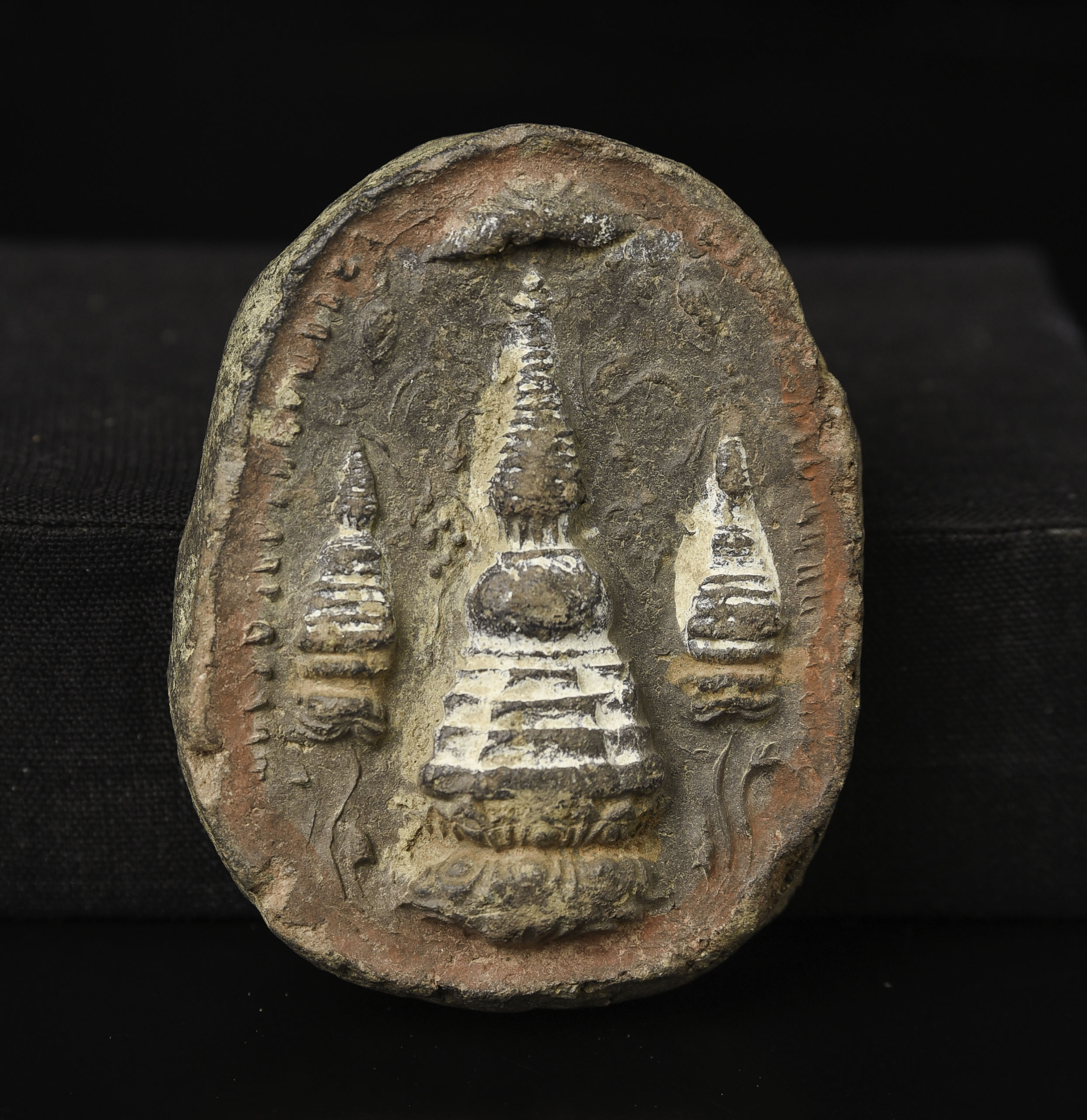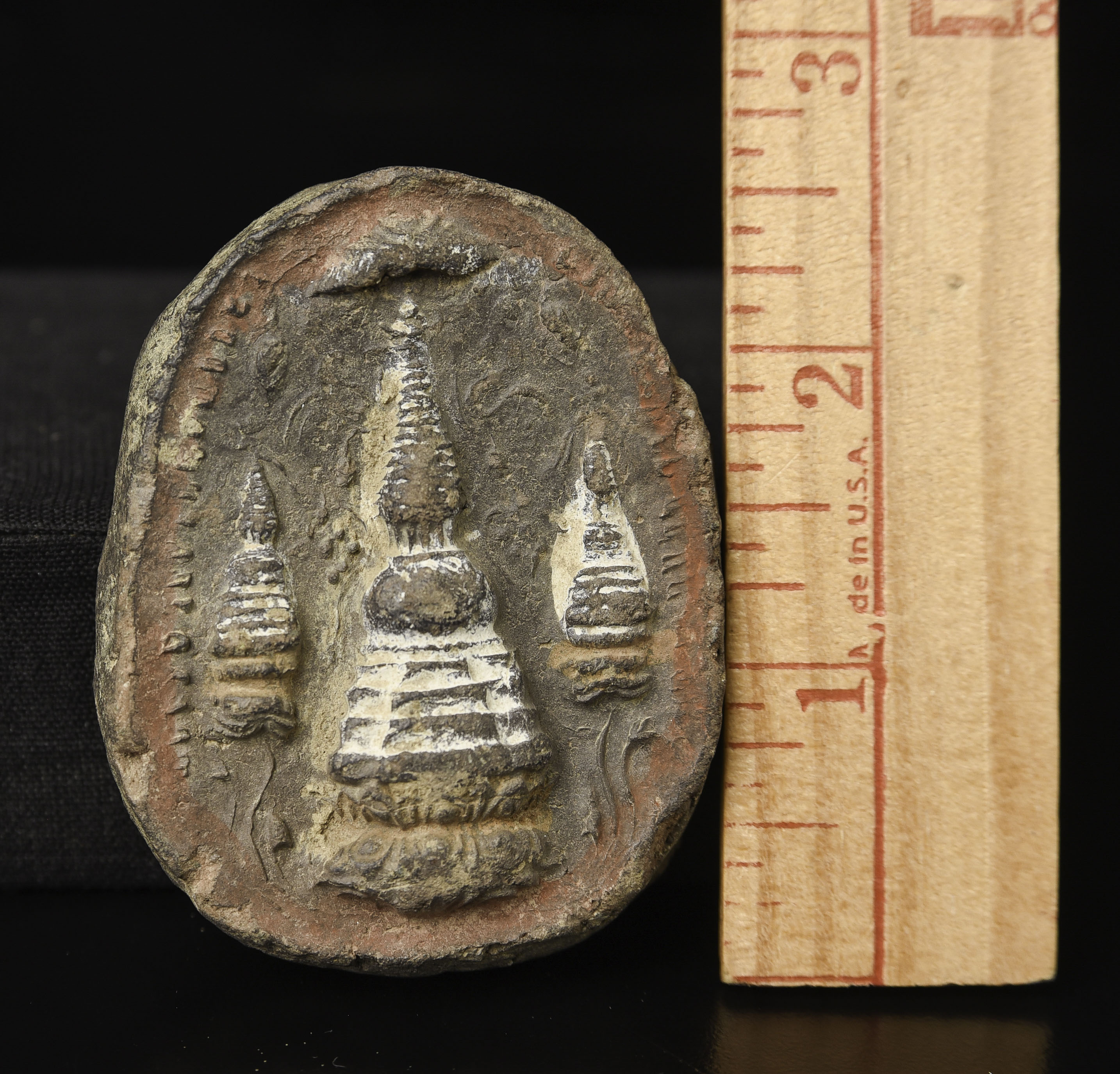 Tibetan Tsa Tsa with Stupa- as early as ELEVENTH or TWELFTH century. Size is 2.5 inches tall, 2 inches wide, .5 inches deep. Rare type. With Stupa on one side and long bit of writing on the other. 60g
