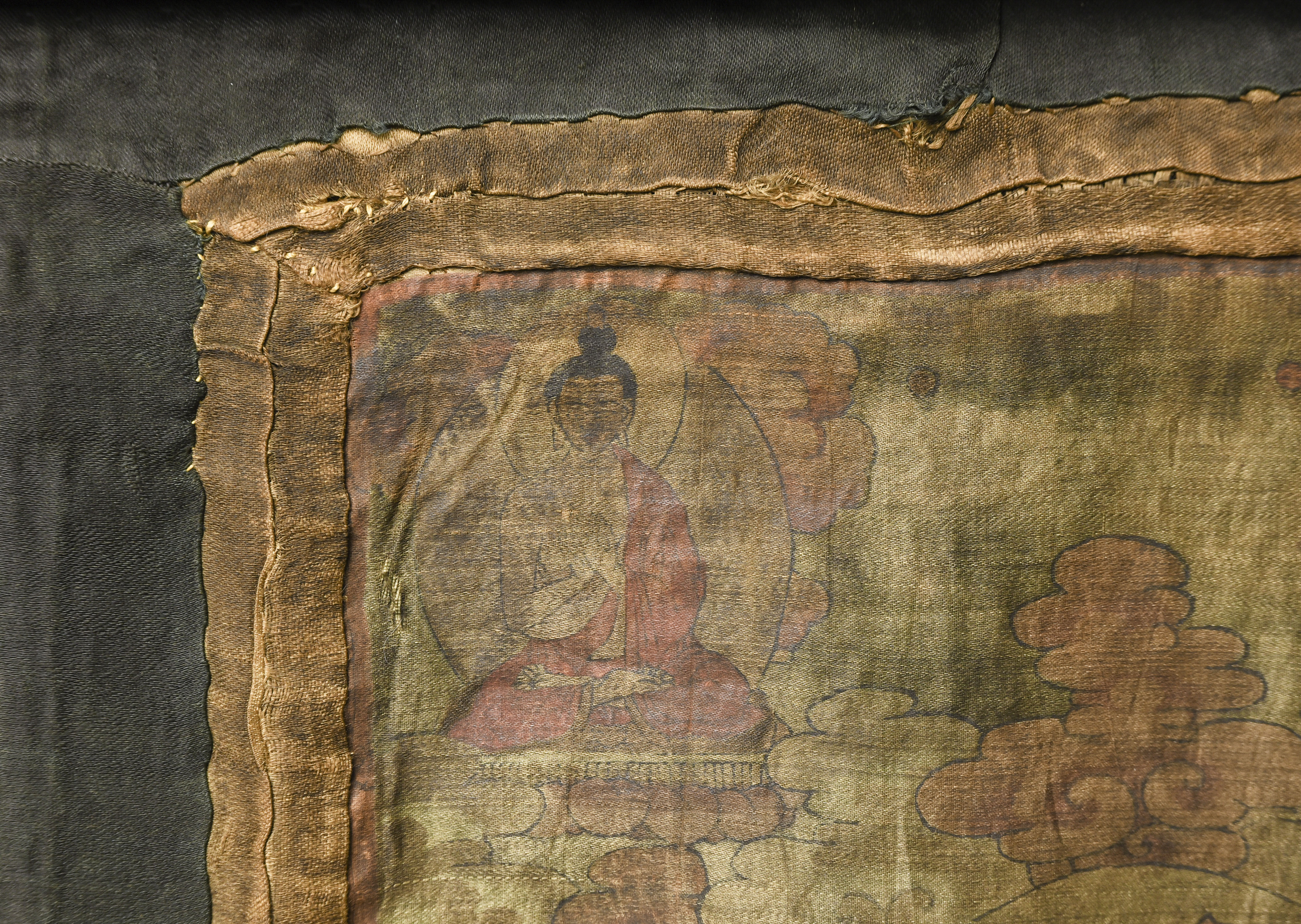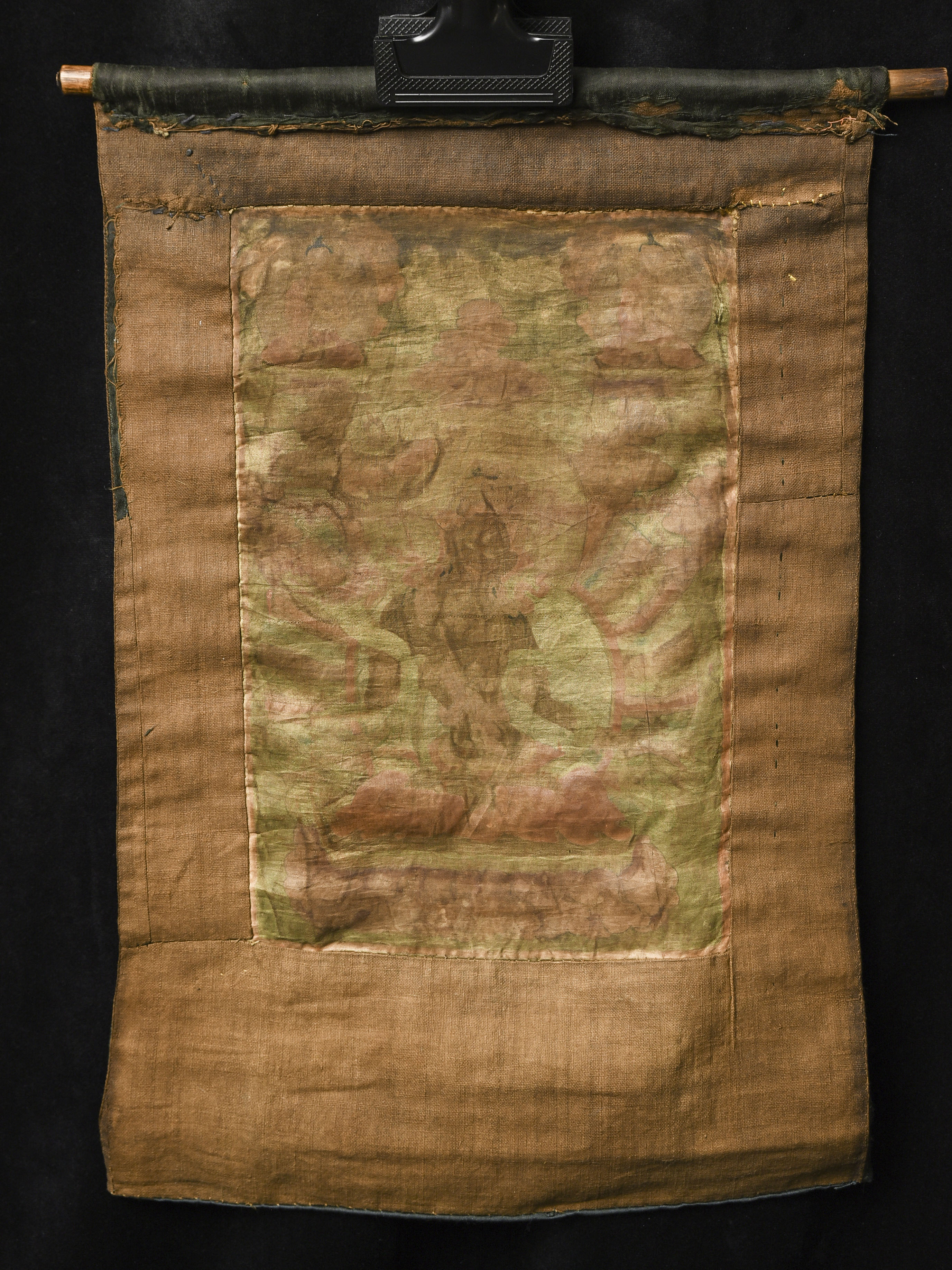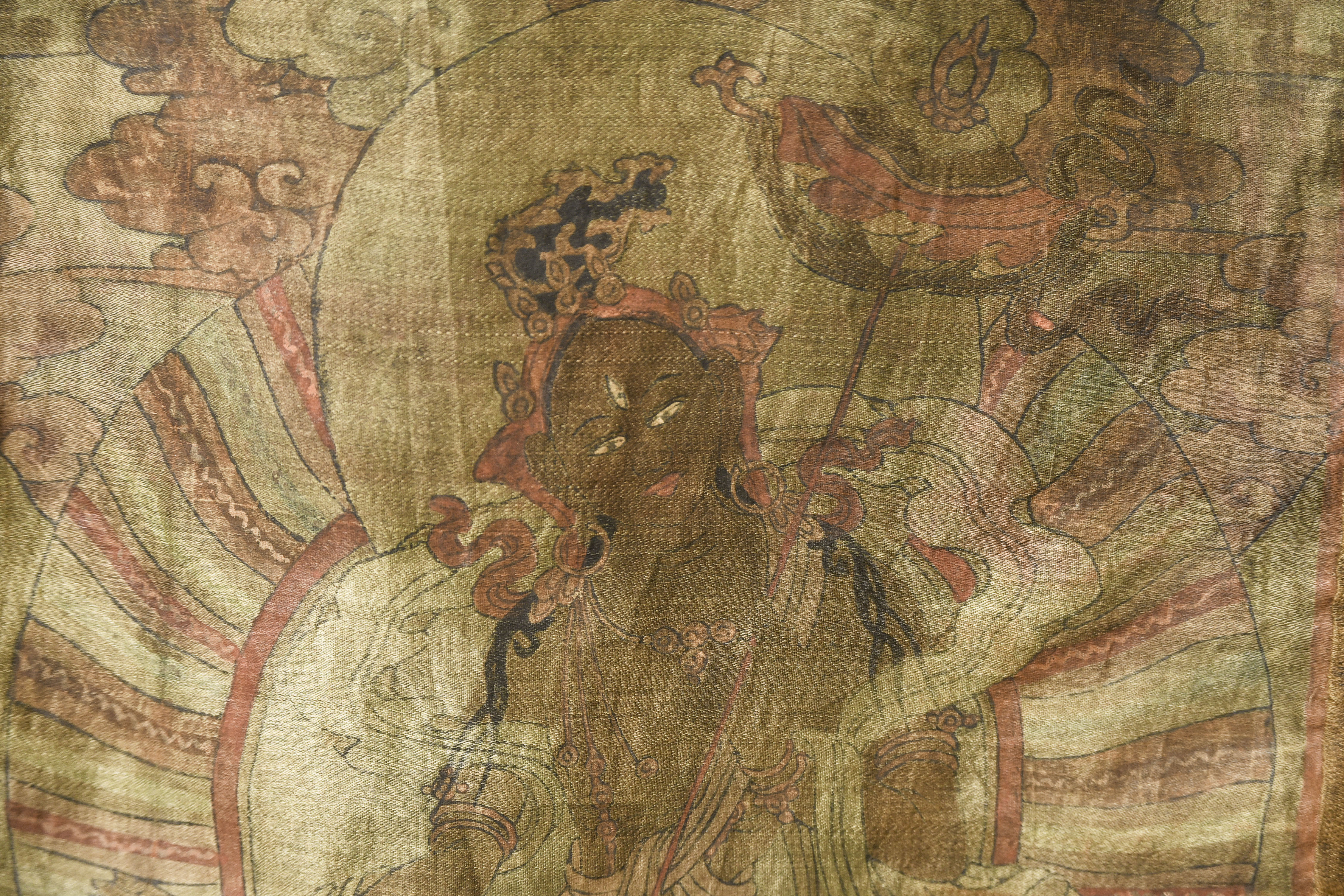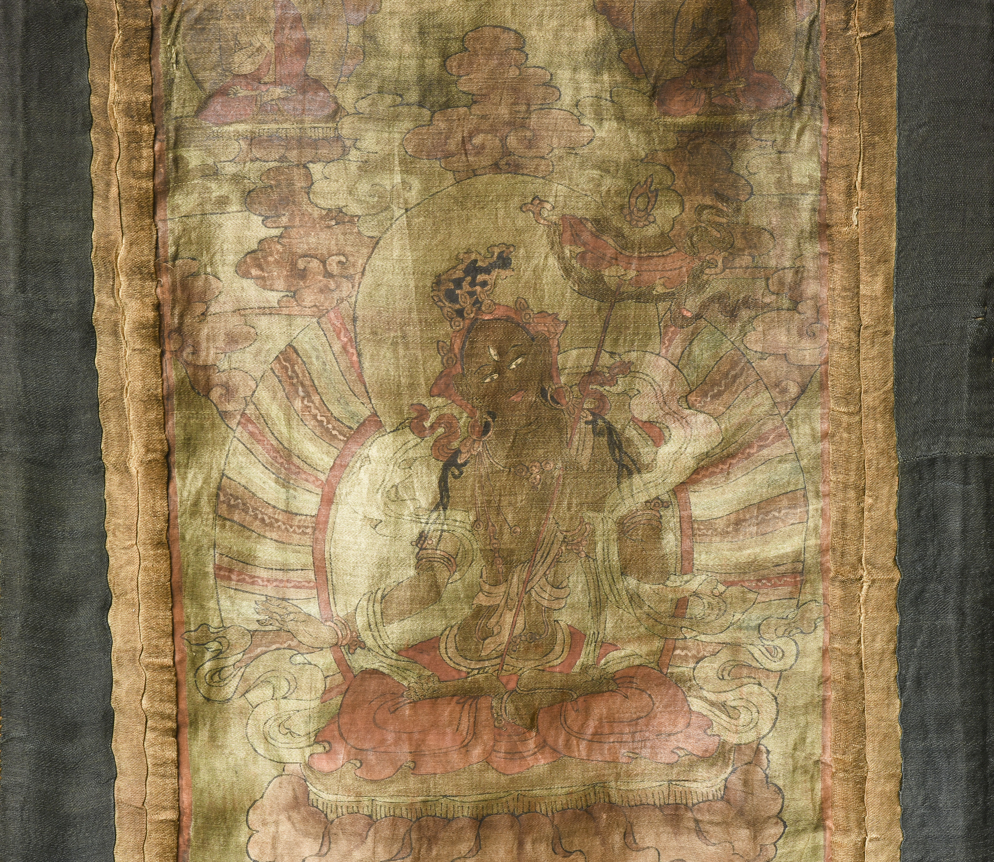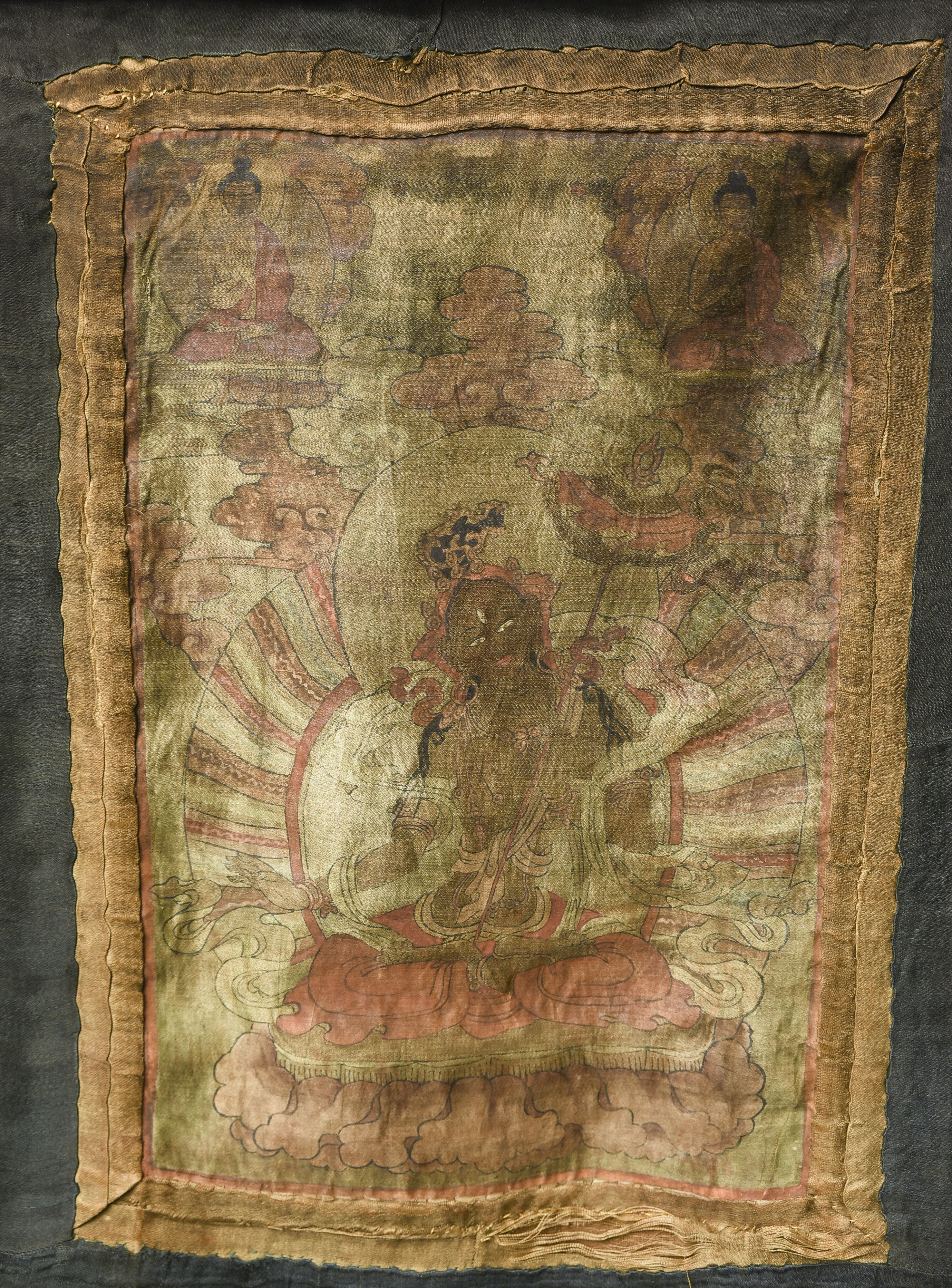 This unusual 19th Century Tibetan/Mongolian thangka is delicately painted on fine silk, a rarer and more refined medium that lends the artwork a soft, luminous quality. The palette—warm reds, rose tones, and muted golds—remains beautifully harmonious despite age. Expected fading and wear are present, consistent with a devotional piece of this period, yet the central deity and surrounding figures retain strong visibility. The silk image measures 12 × 8 inches, while the full textile mount extends to 19 × 12.5 inches. An evocative, hard-to-find thangka offered with a lowered starting price, ideal for collectors of early Himalayan art.