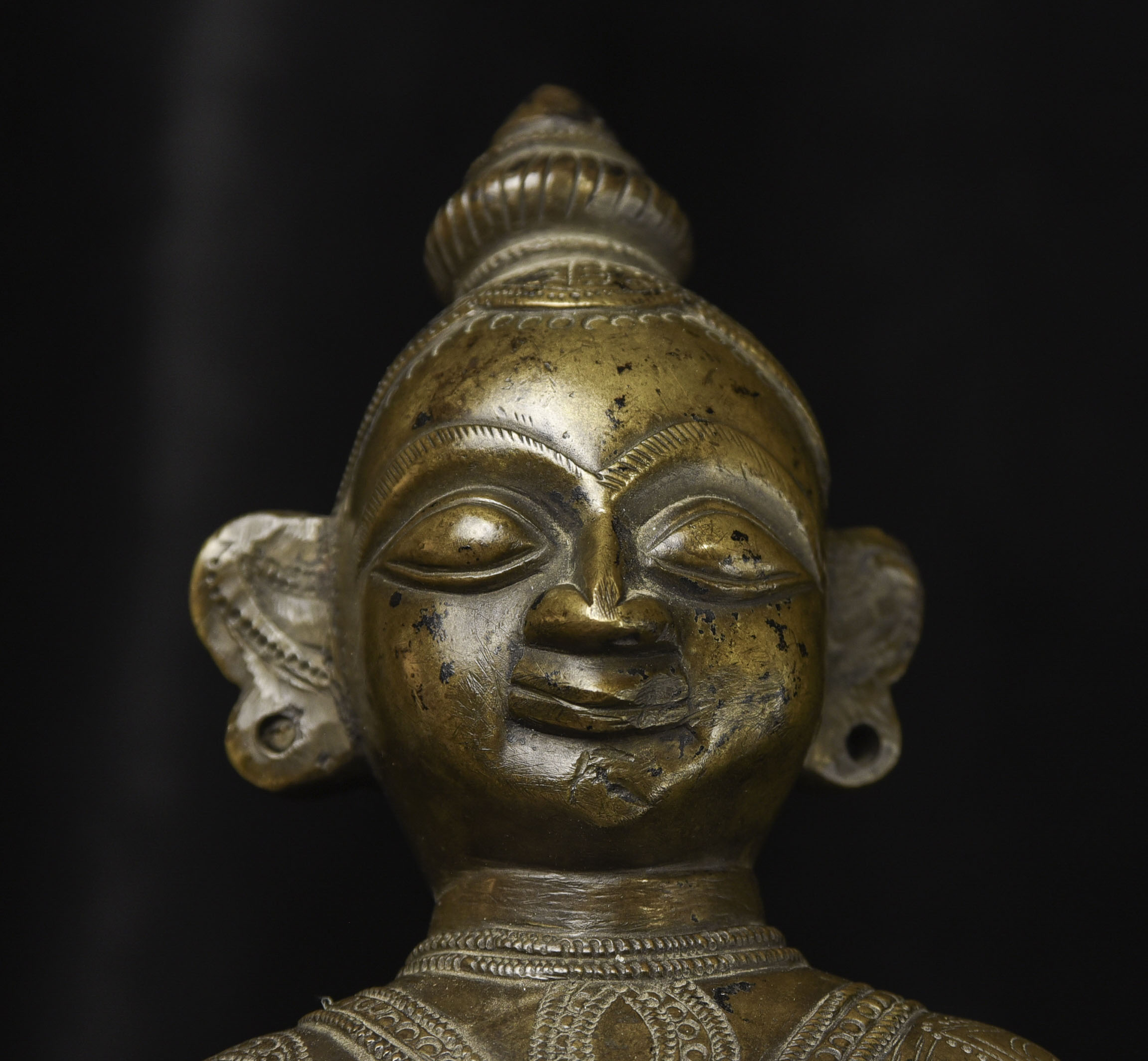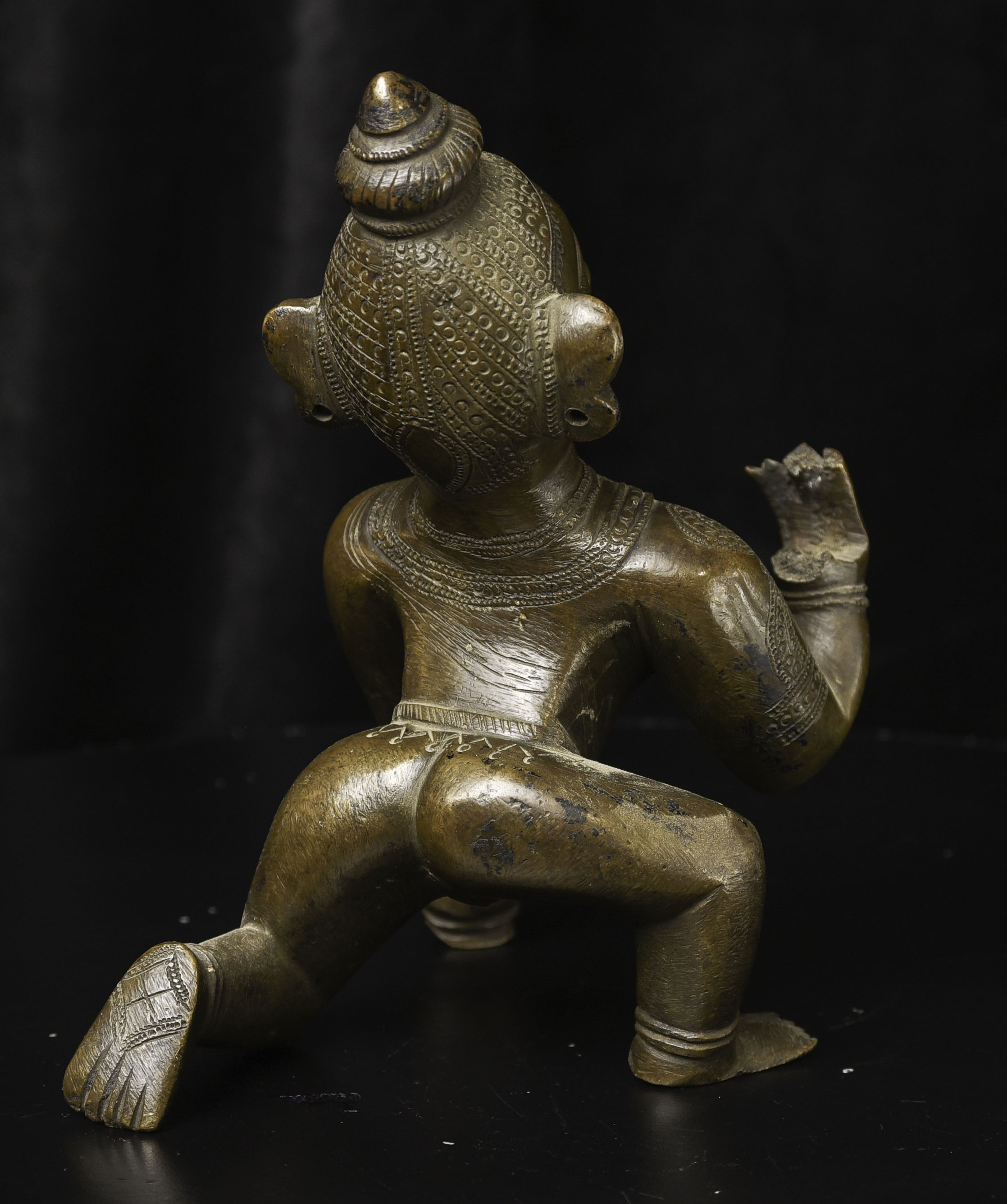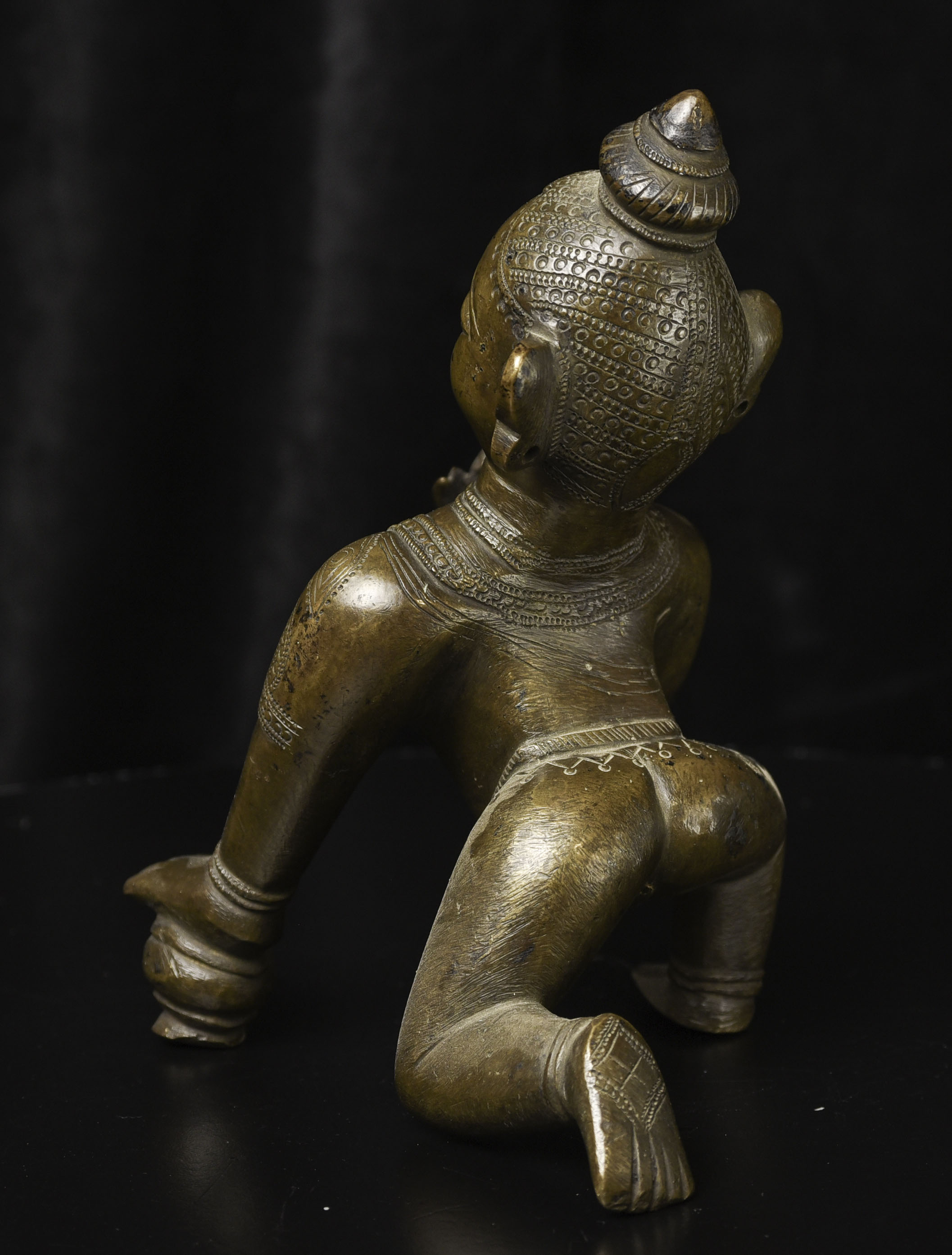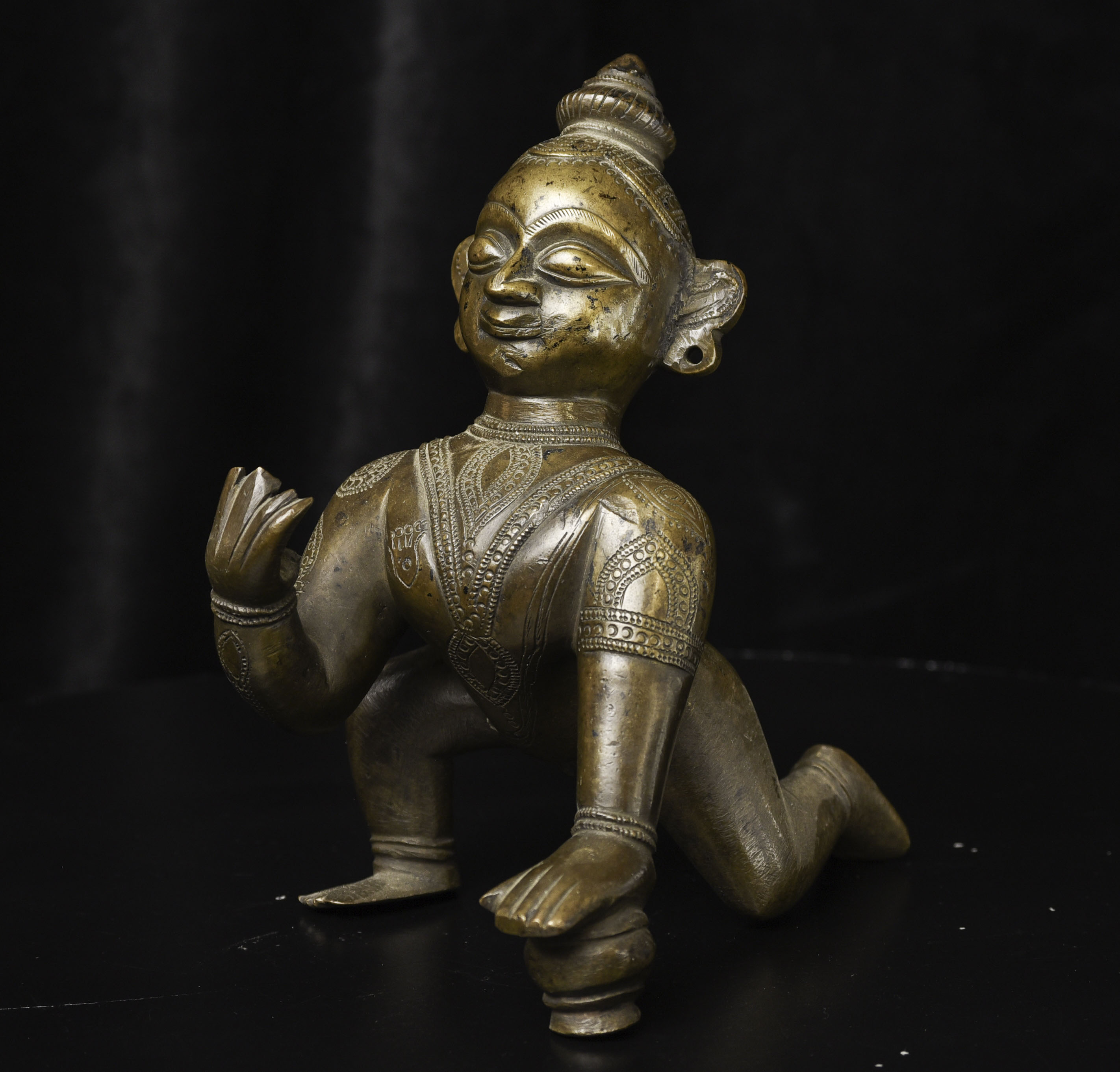 Huge antique baby Krishna, Incredibly heavy. Loss of butterball along with fingertips in one hand. Largest I've offered- he probably weighs as much as 20 baby Krishna's of typical size. (7.25"H x 4"W x 6"D ) - 6.88lbs / 3.120kg
