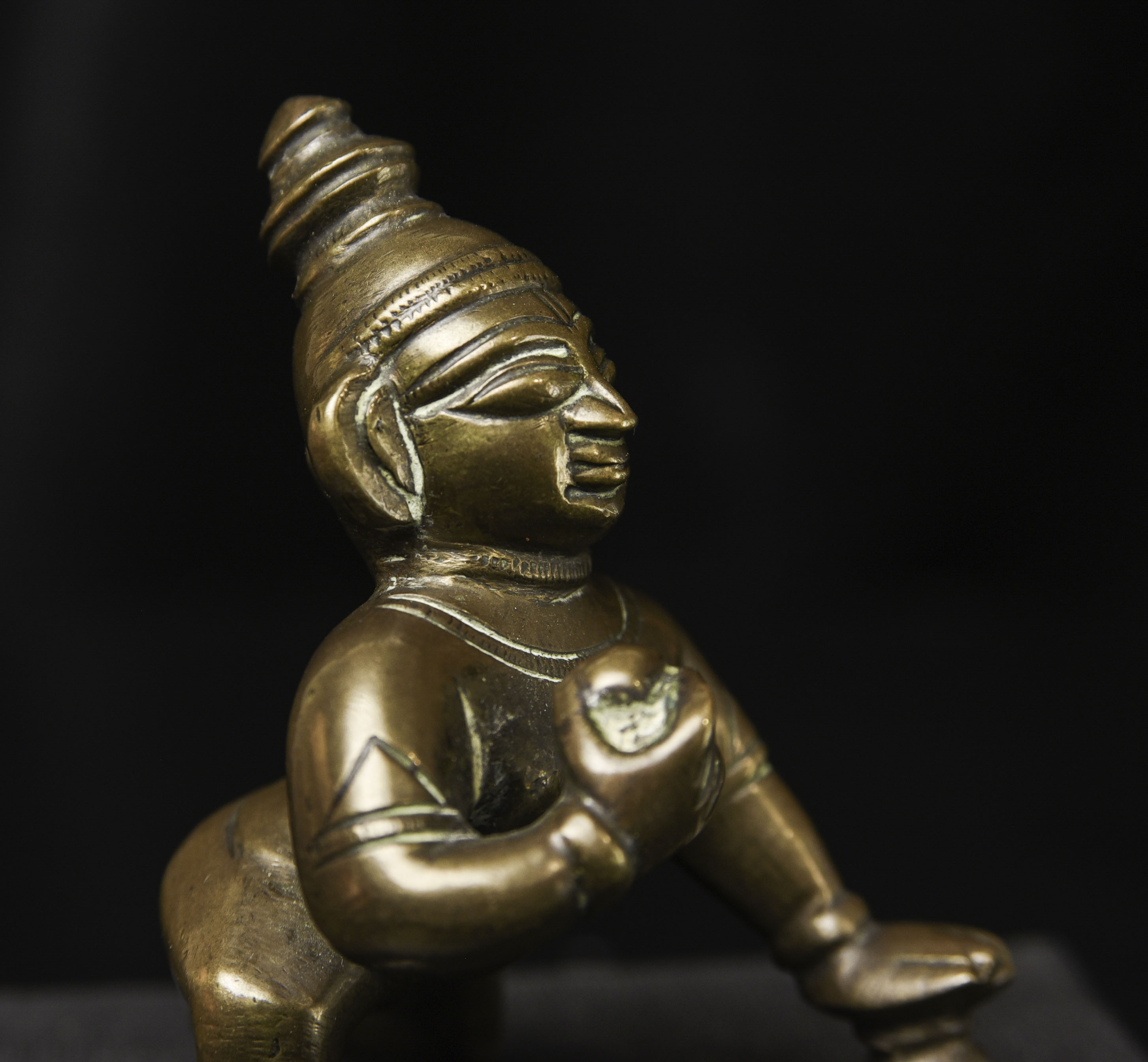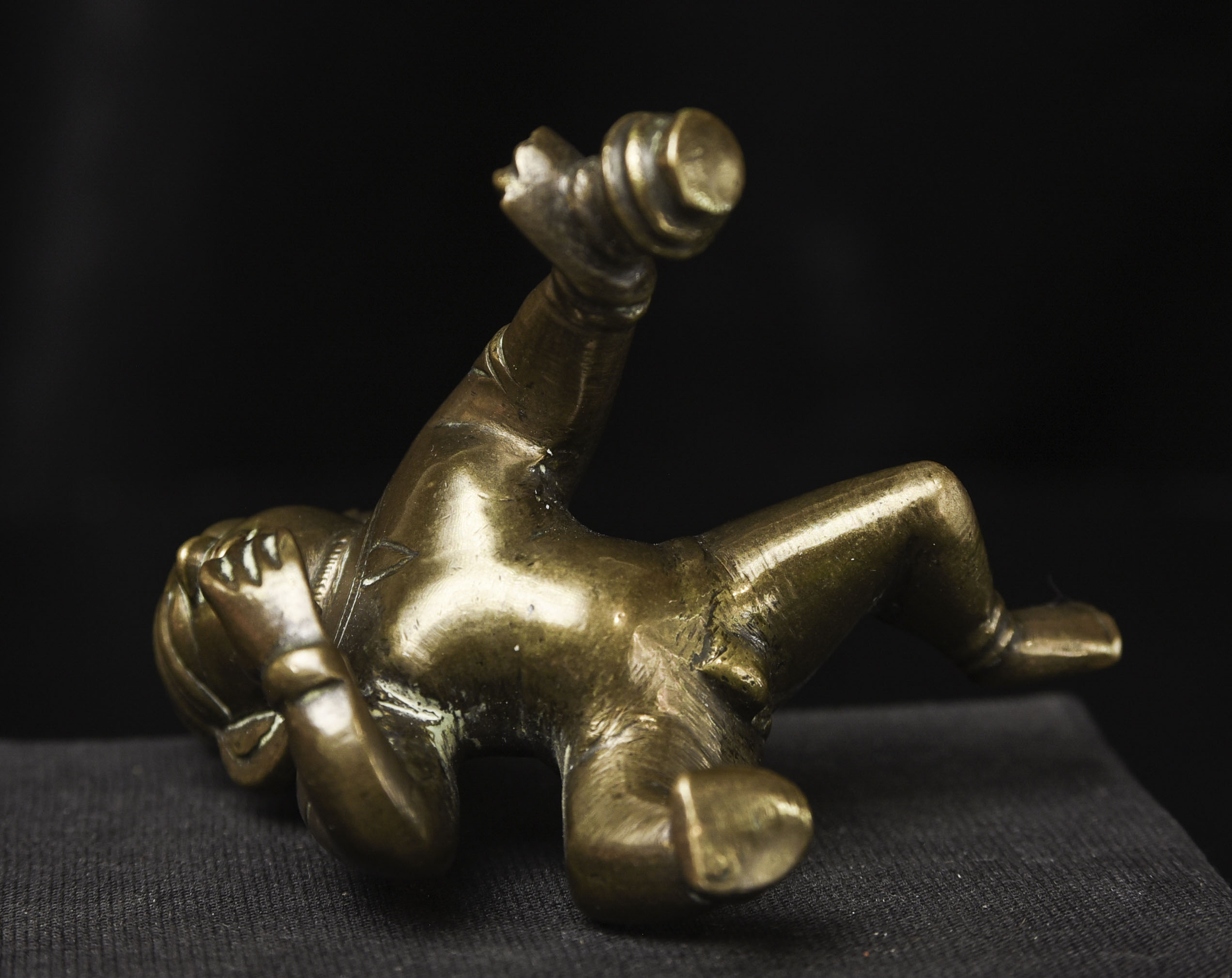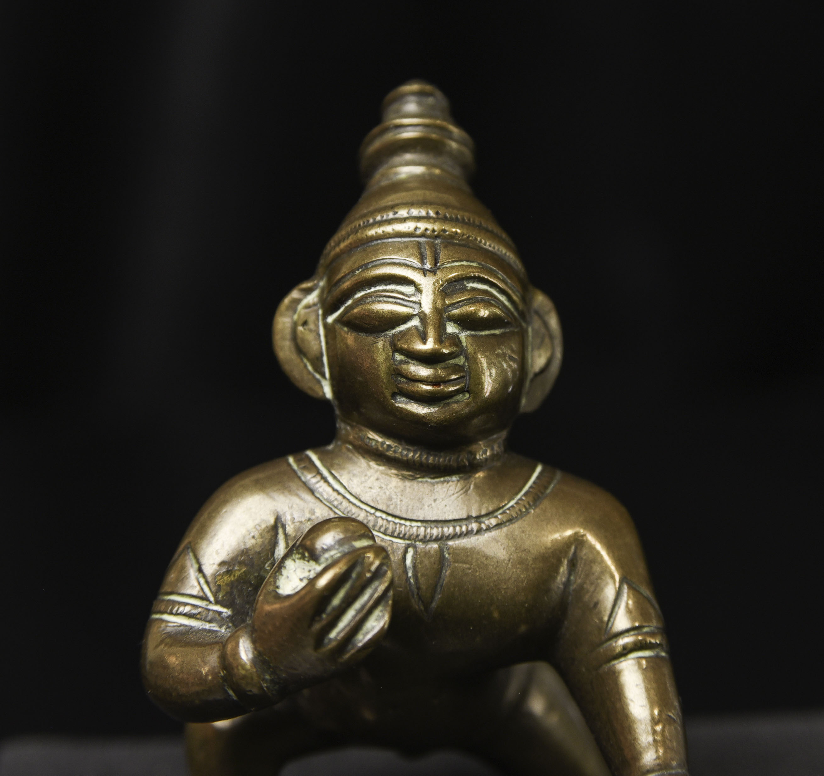 Antique Indian bronze Baby Krishna with his butterball. Happy face. (3"H x 2.25"W x 2.75"D ) - 245g
