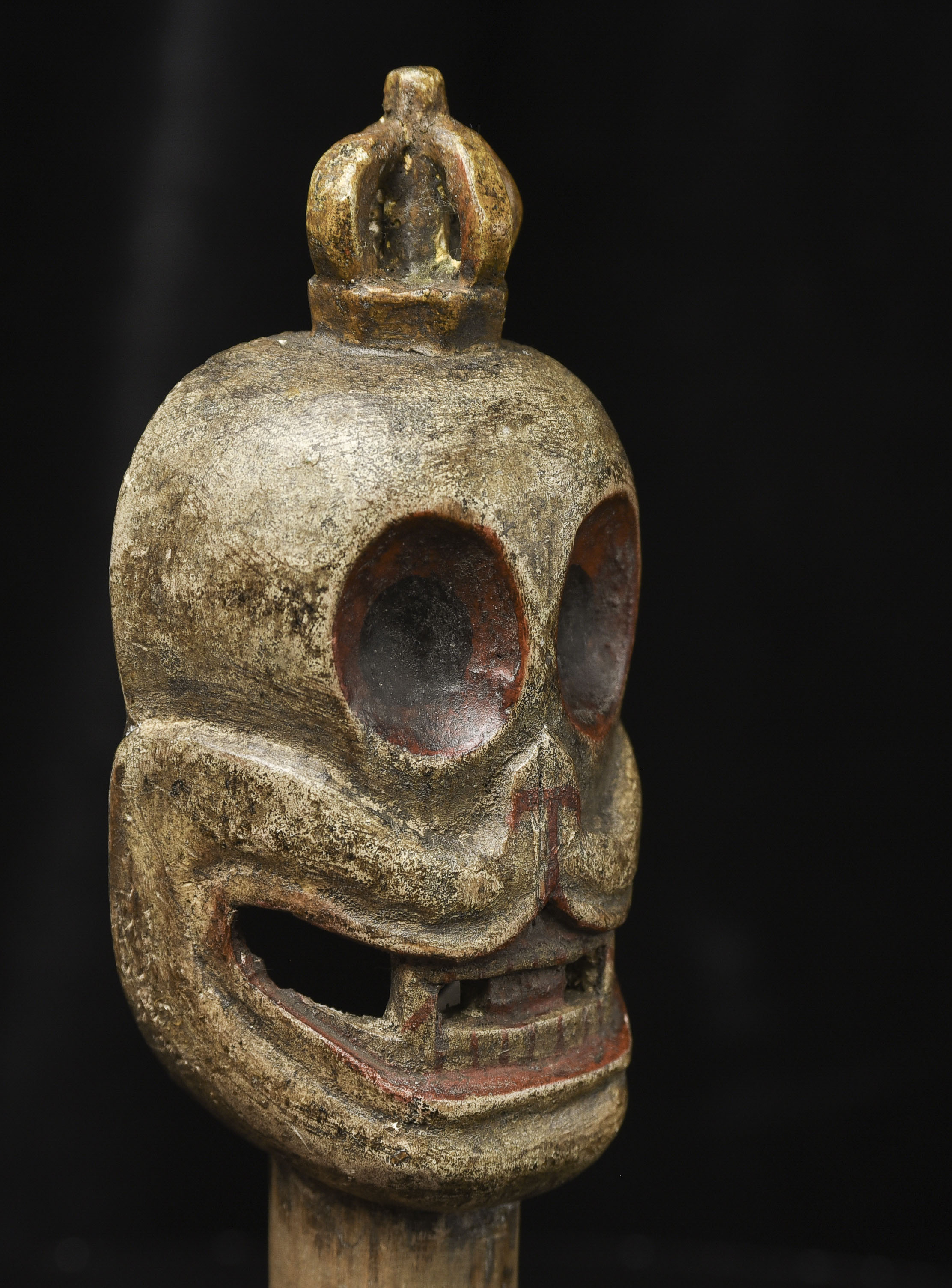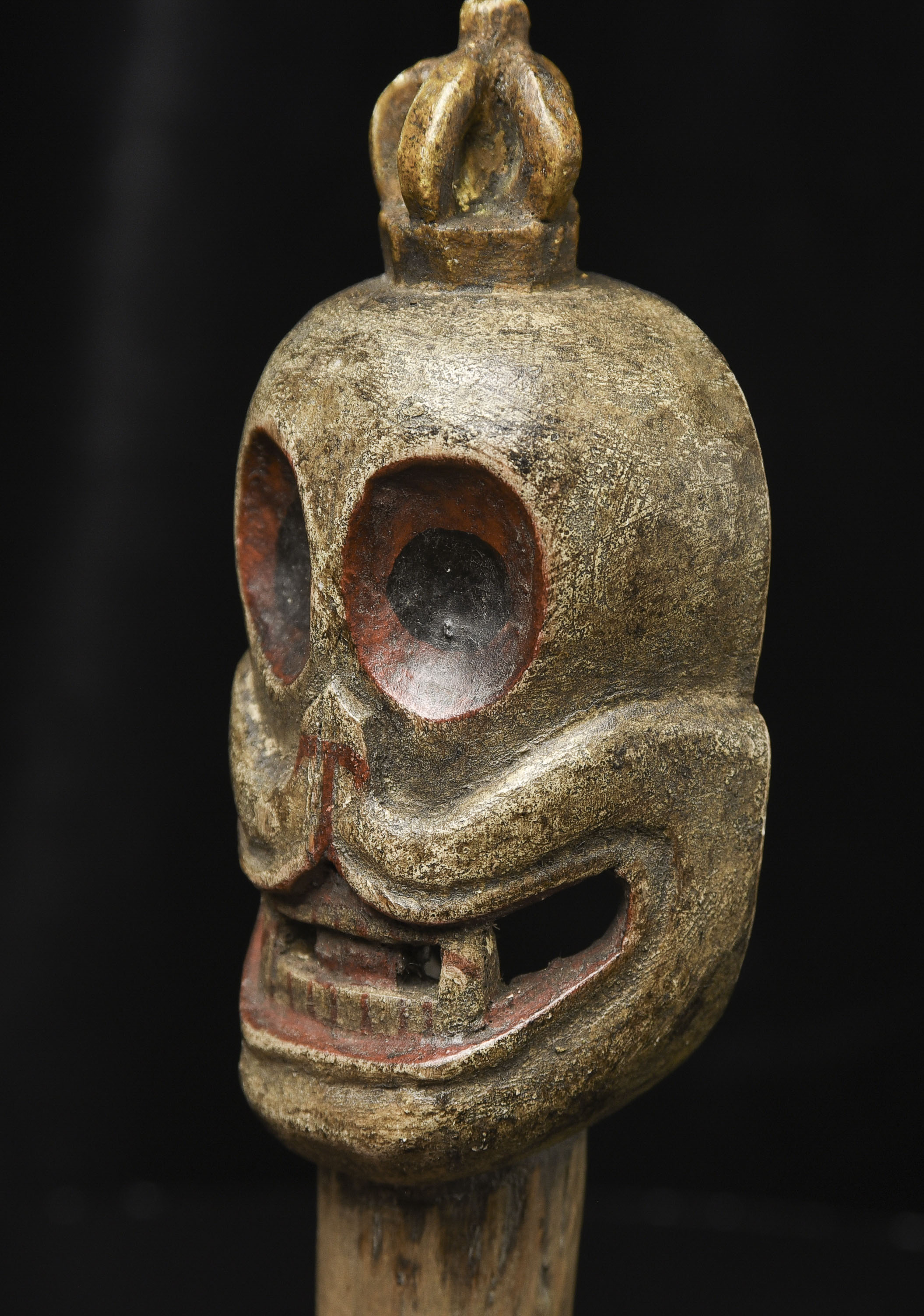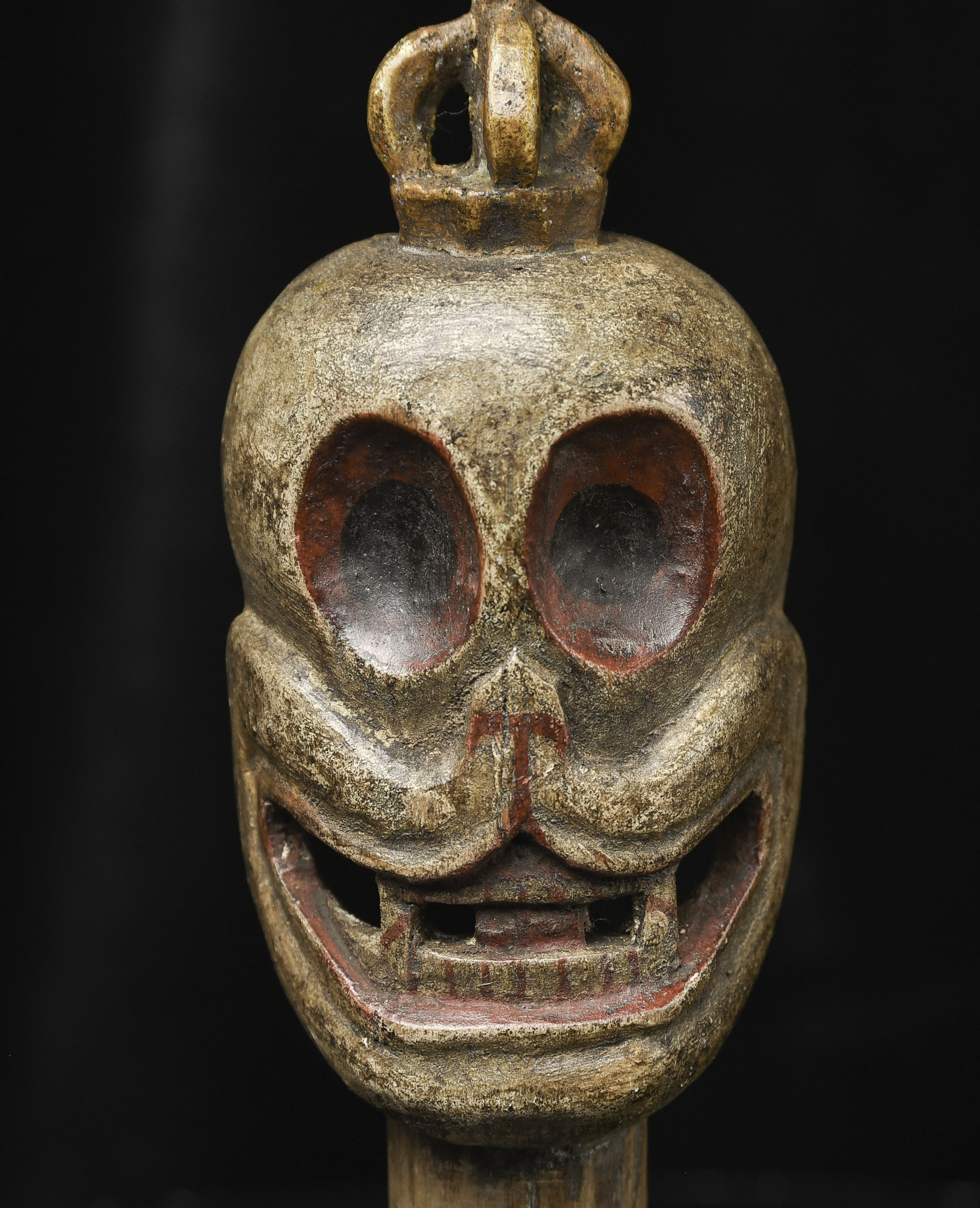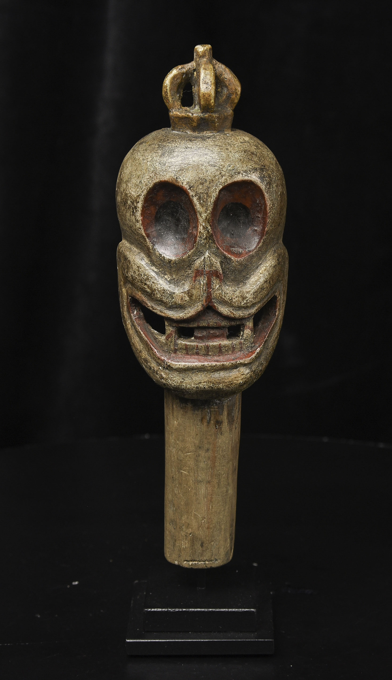 18/19thC Tibetan or Mongolian Citi Pati head on a short "neck" pole. Very fine example of its type. Powerfully animated, Hard to find like this. ( 7.75"H x 2.5"W x 1.5"D ) - 365g W/ recently made custom base