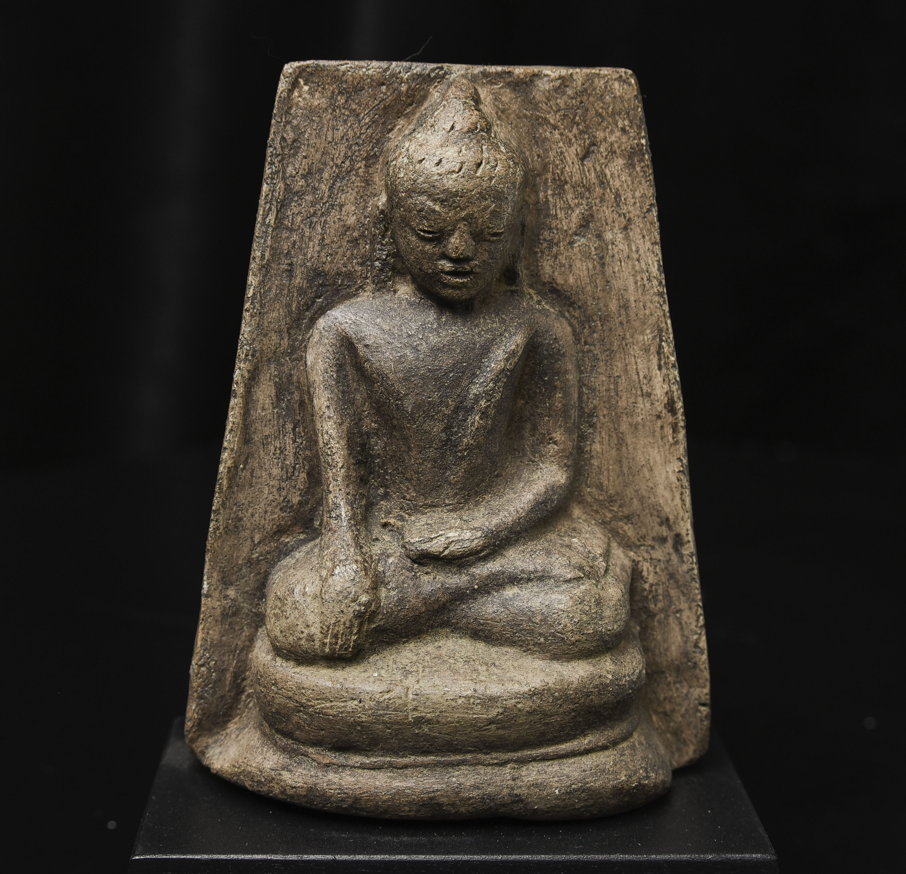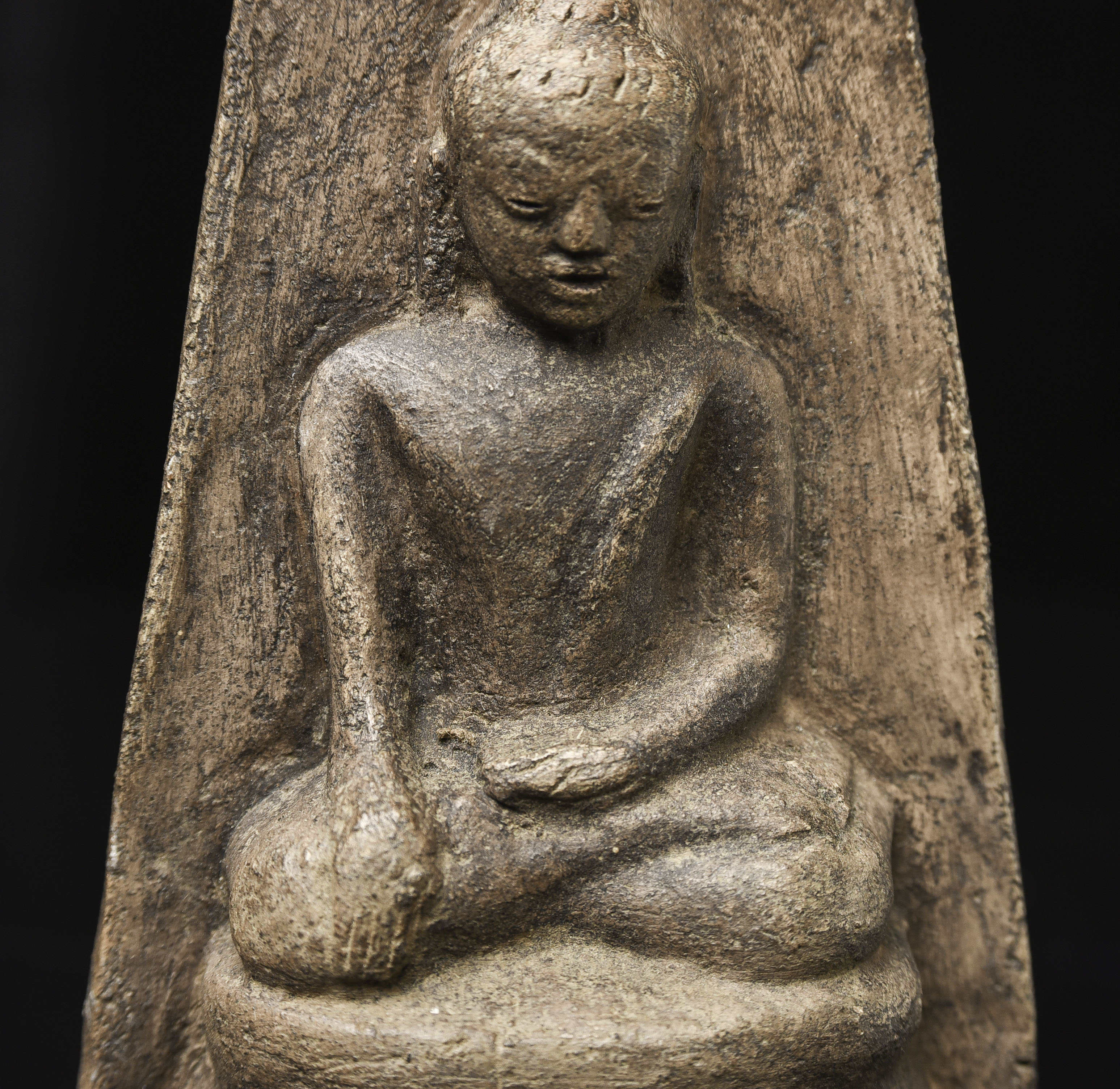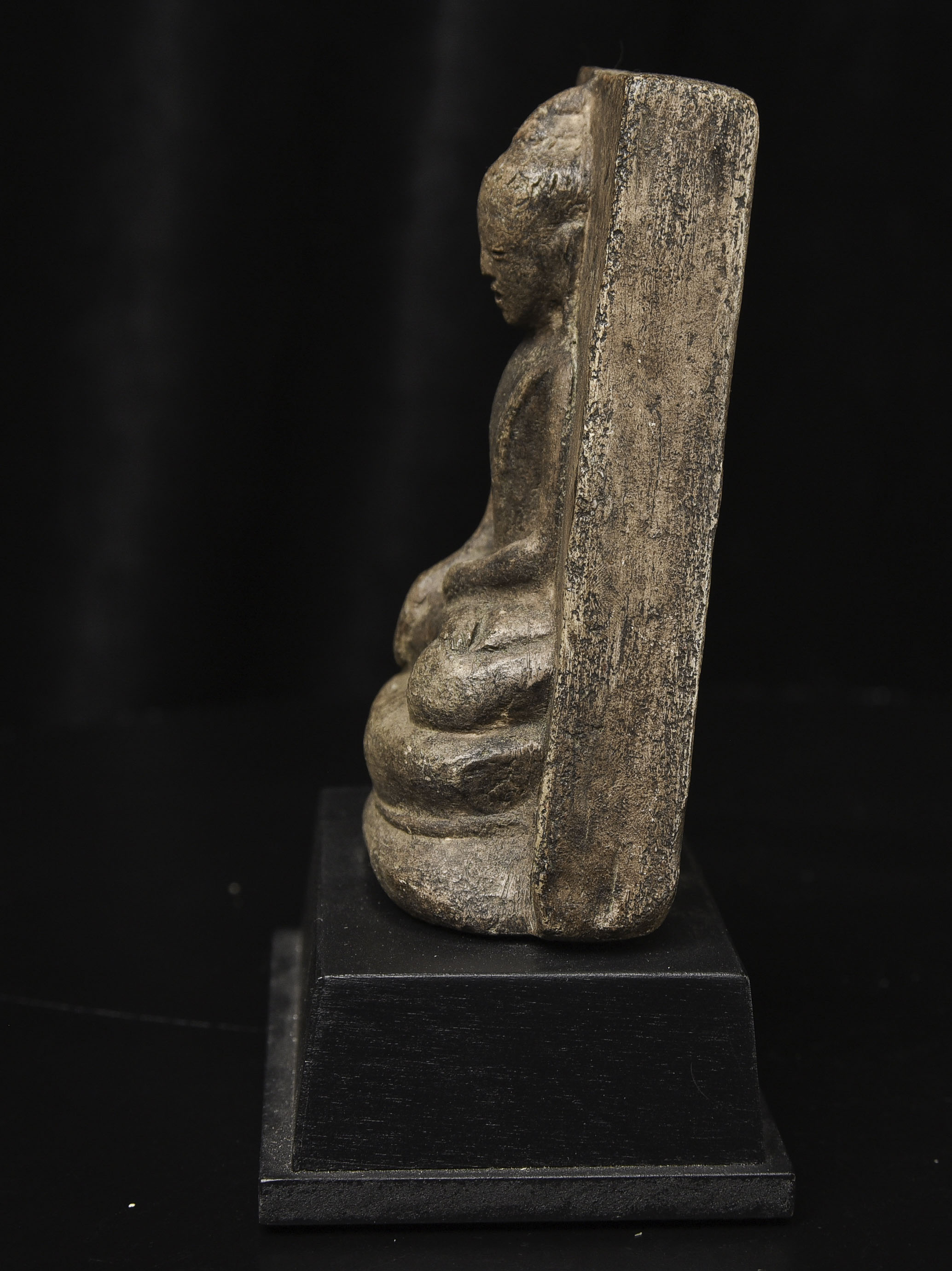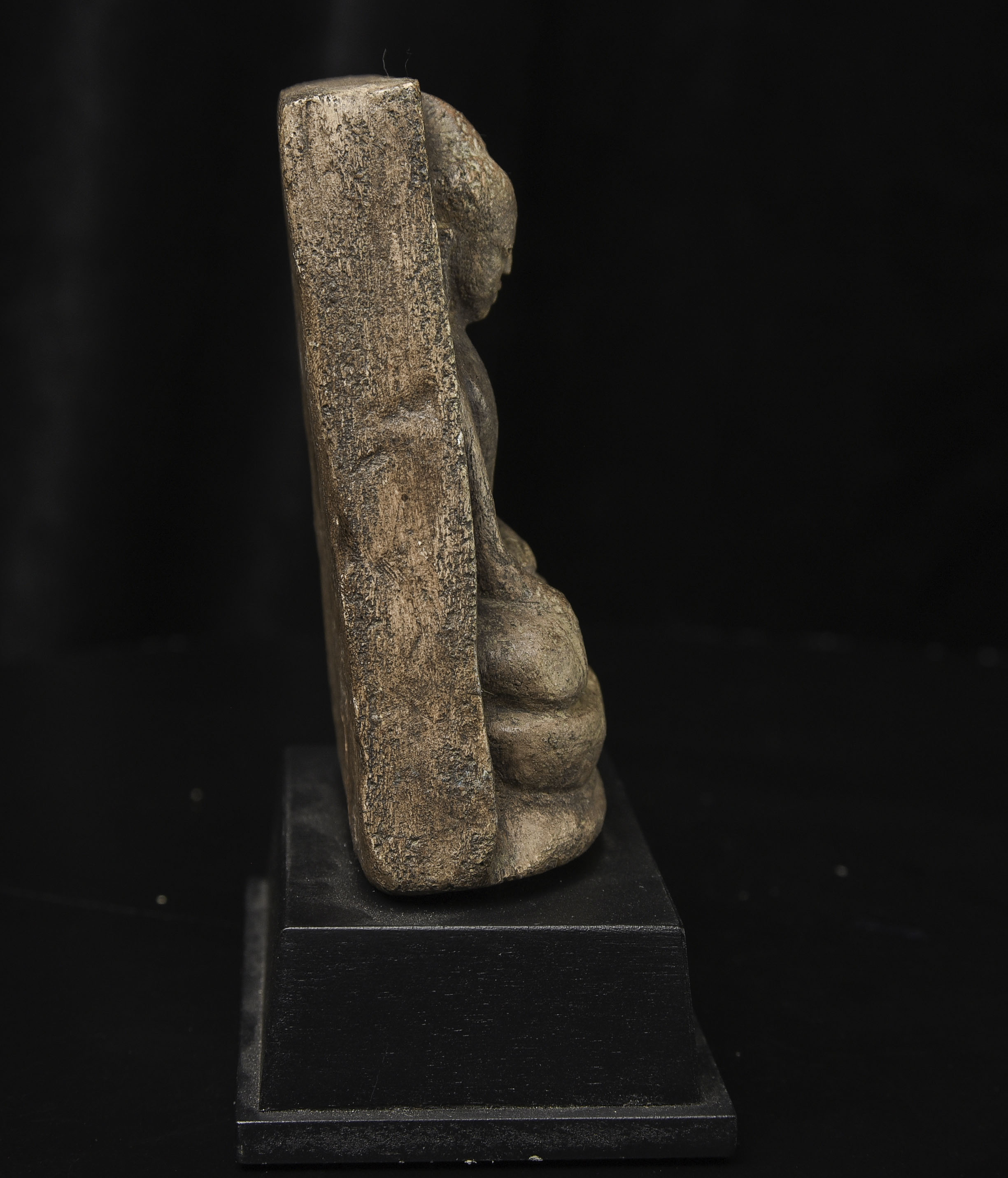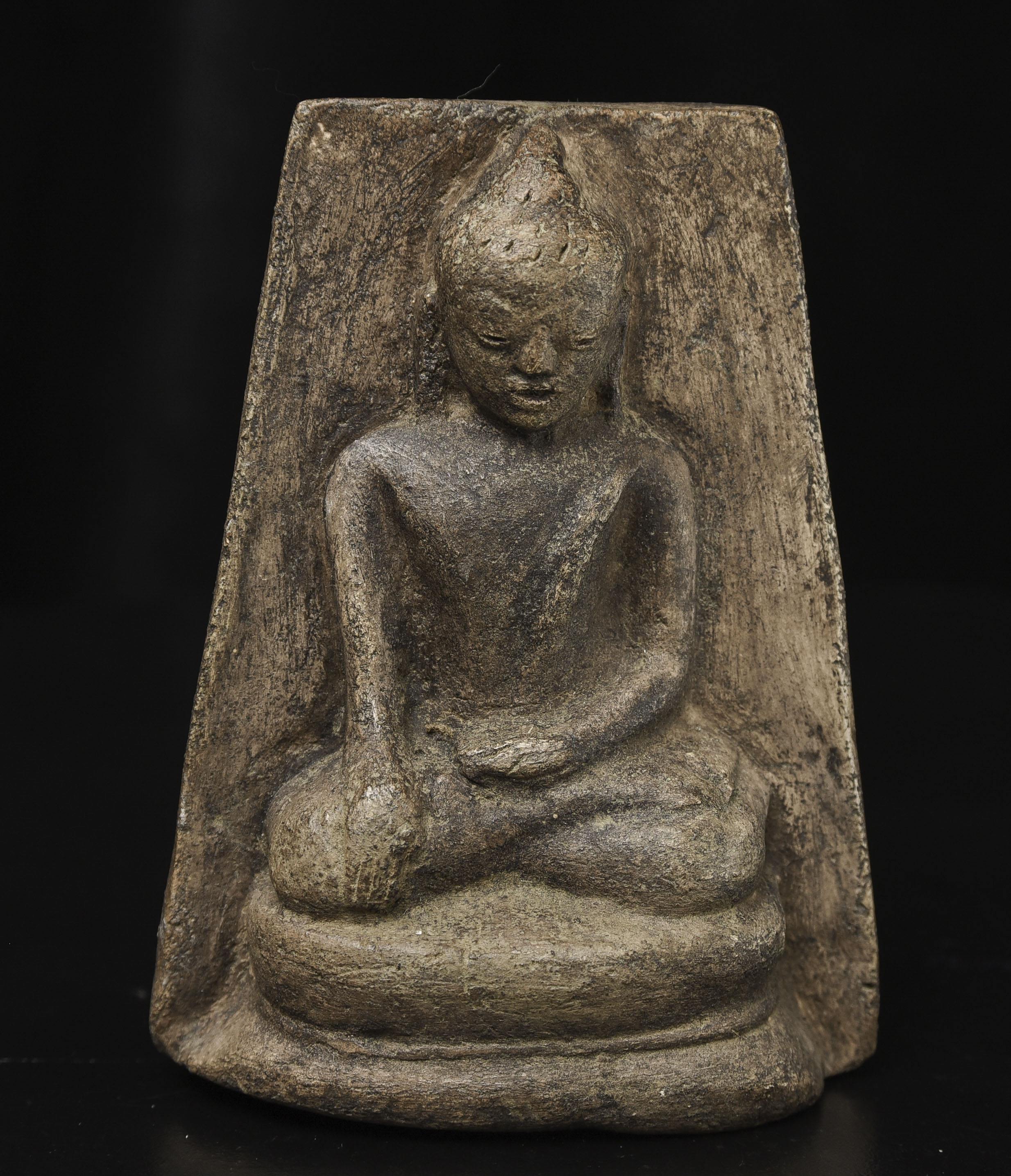 15-17thC Burmese Buddha-probably Ava or Arakan style, though I am unsure. Very unusual type I have not seen before-cast in the 3/4 round our of clay. Very expressive face.( 4.5"H x 3.375"W x 1.5"D ) - 500g w/base