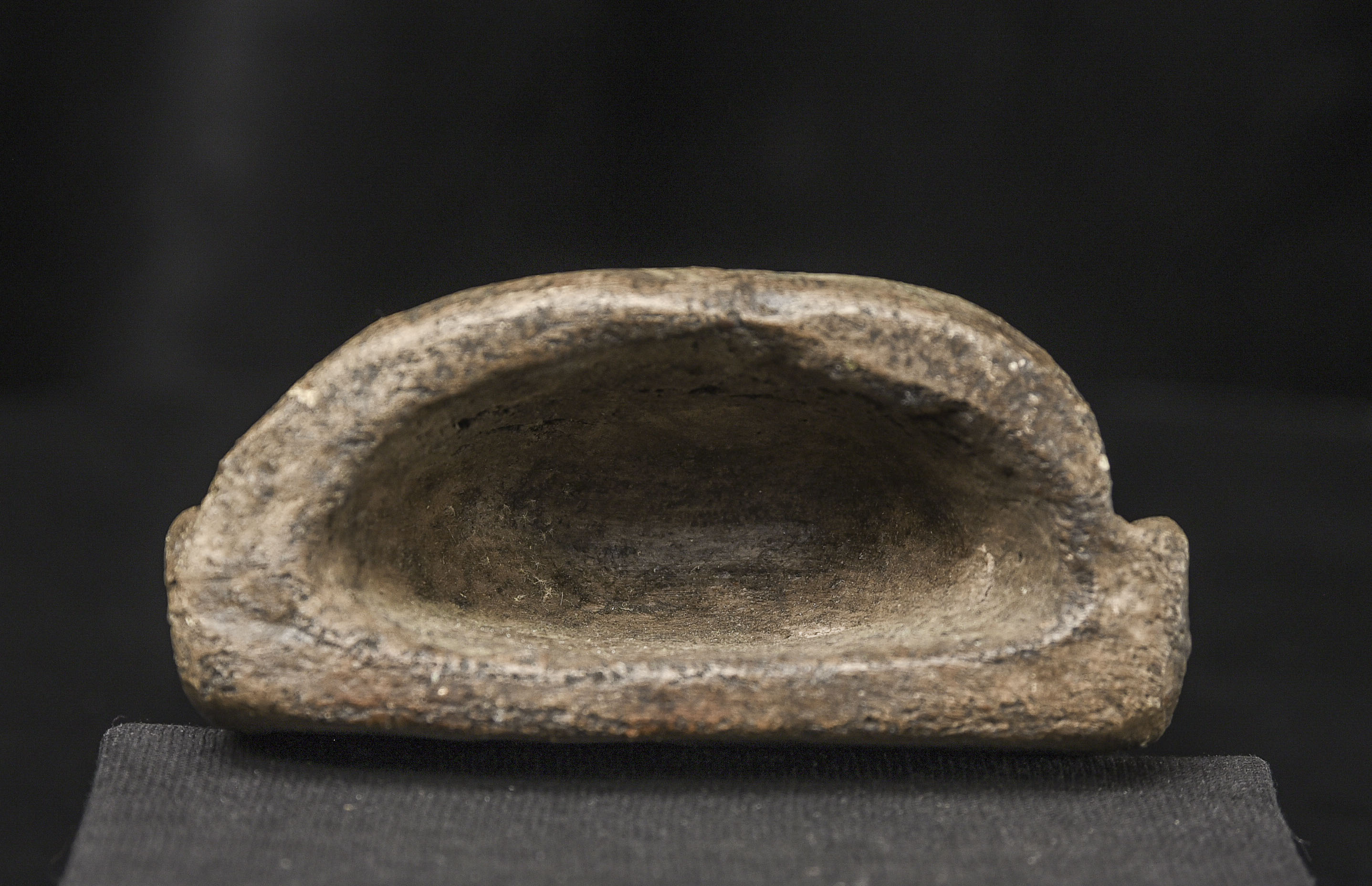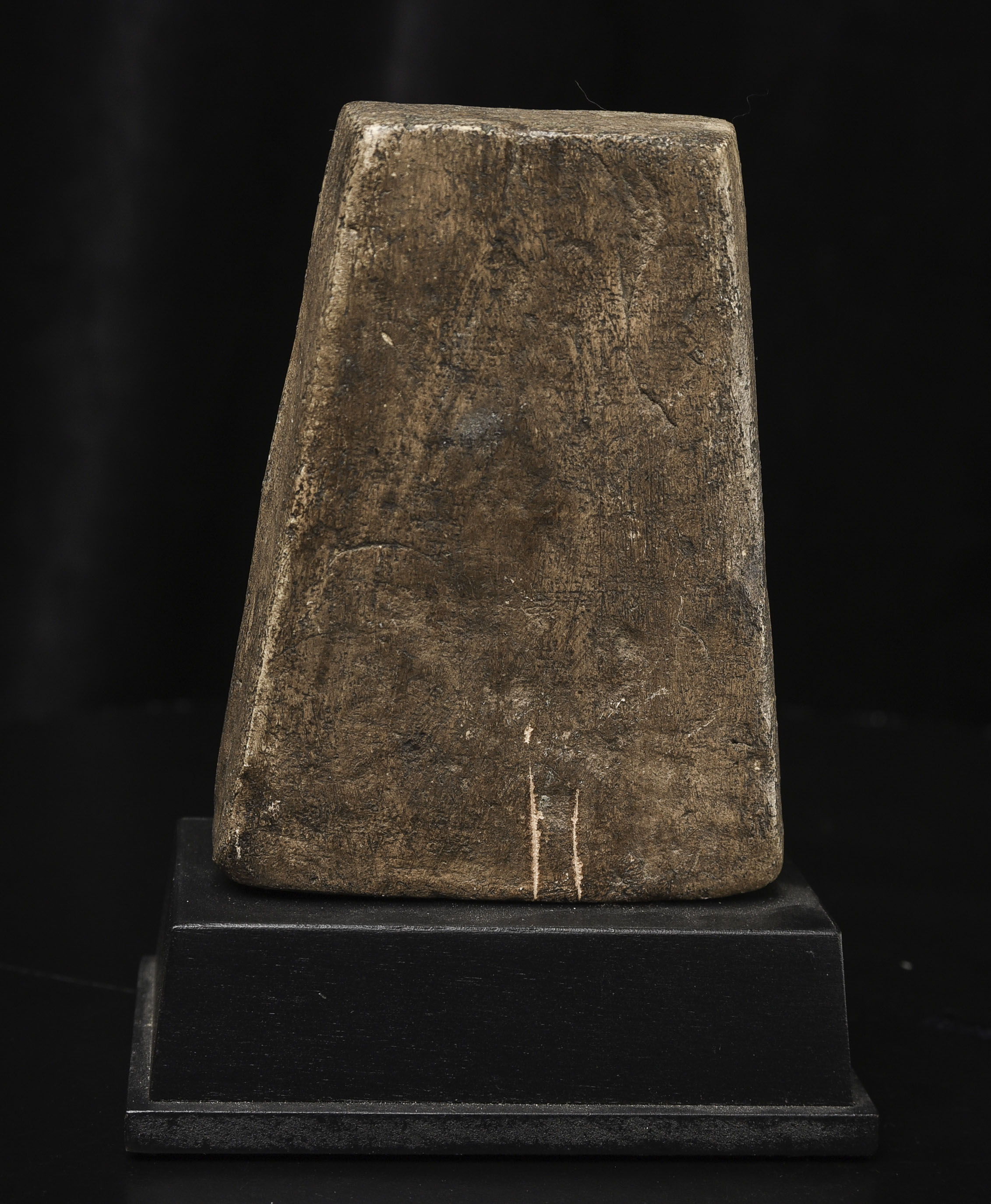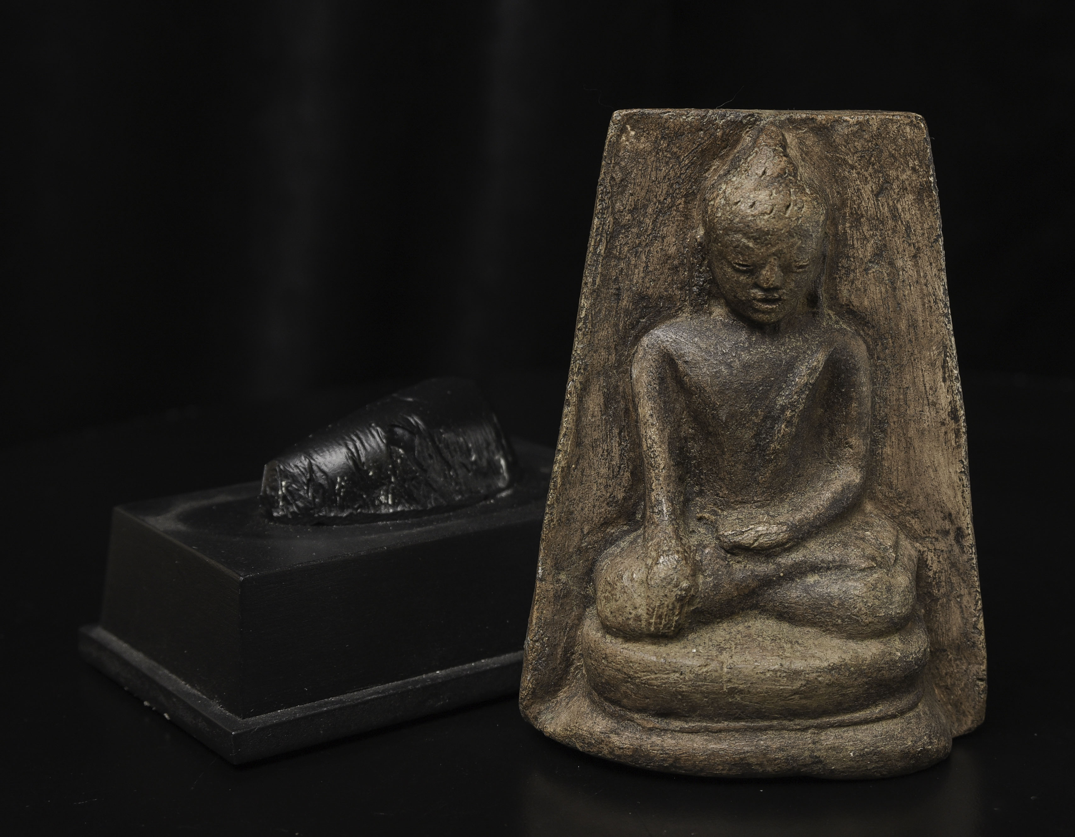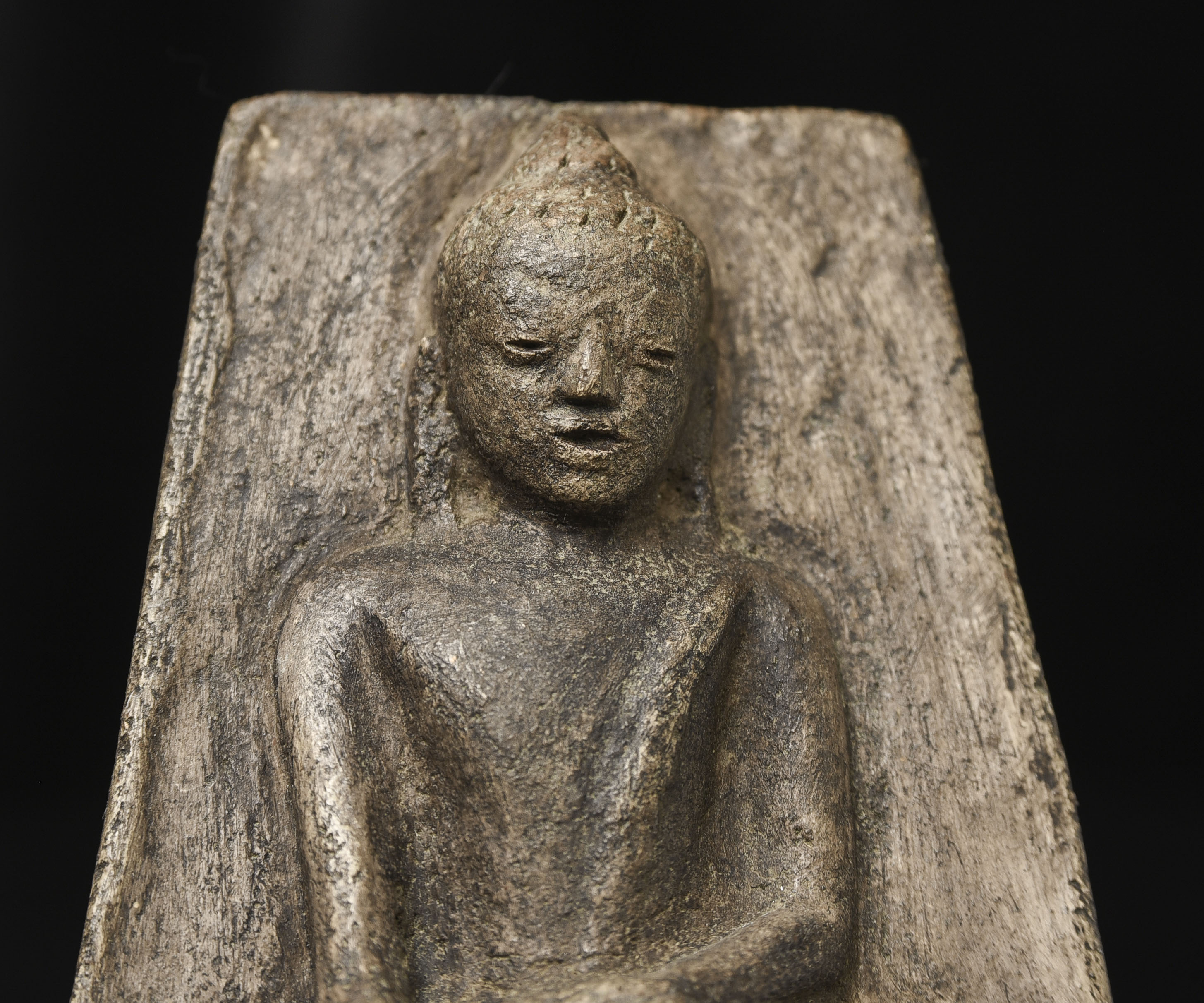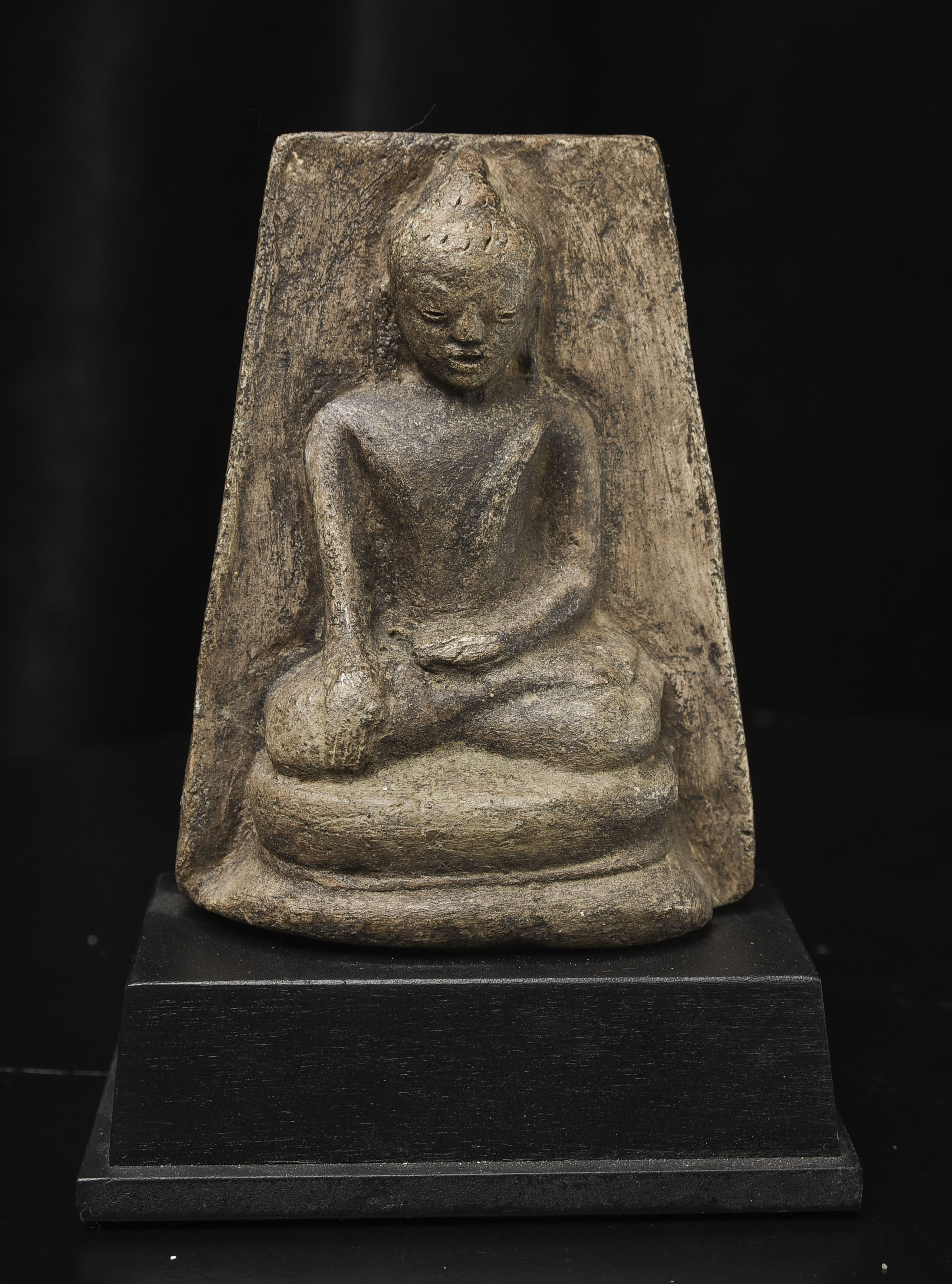 15-17thC Burmese Buddha-probably Ava or Arakan style, though I am unsure. Very unusual type I have not seen before-cast in the 3/4 round our of clay. Very expressive face.( 4.5"H x 3.375"W x 1.5"D ) - 500g w/base