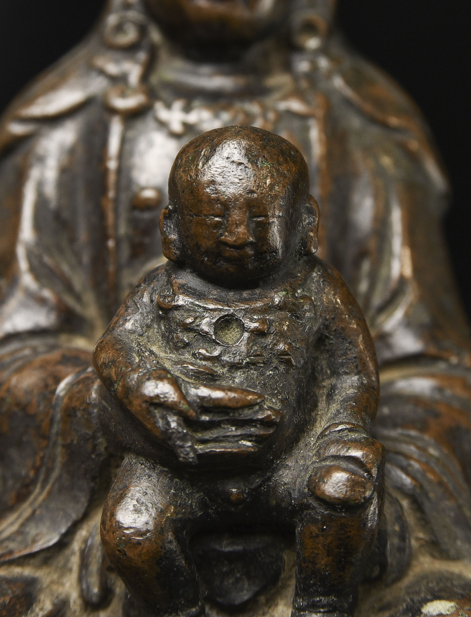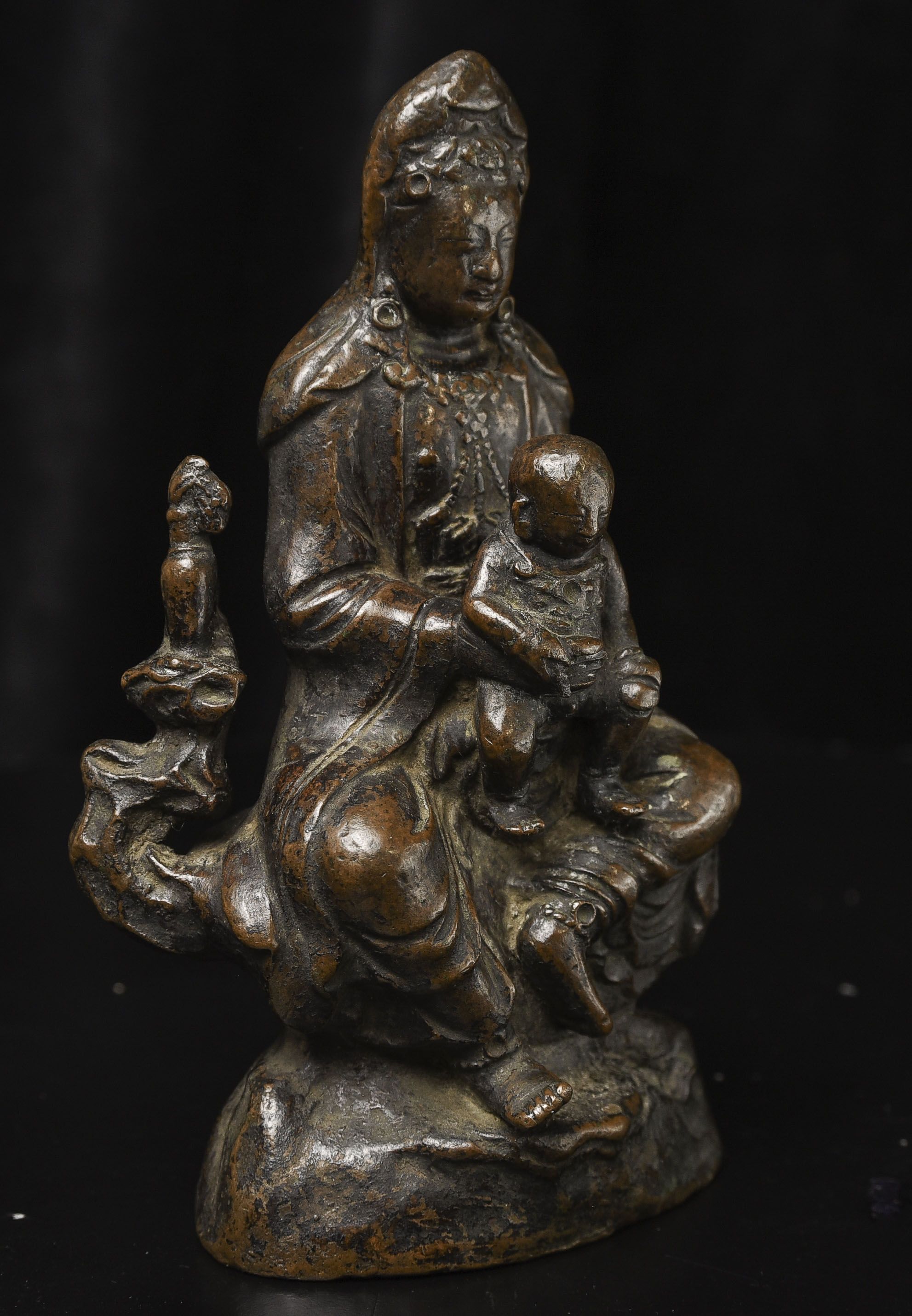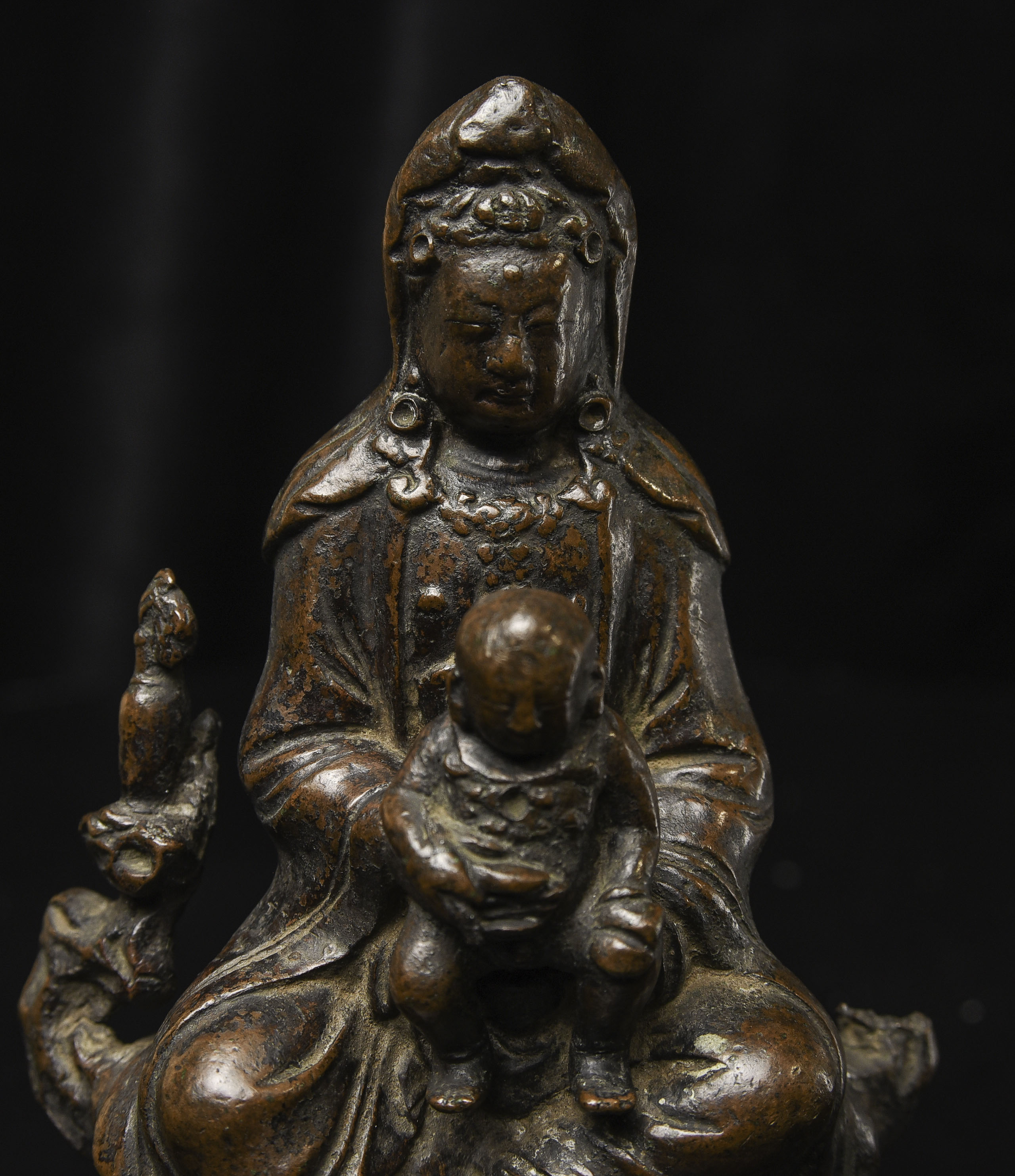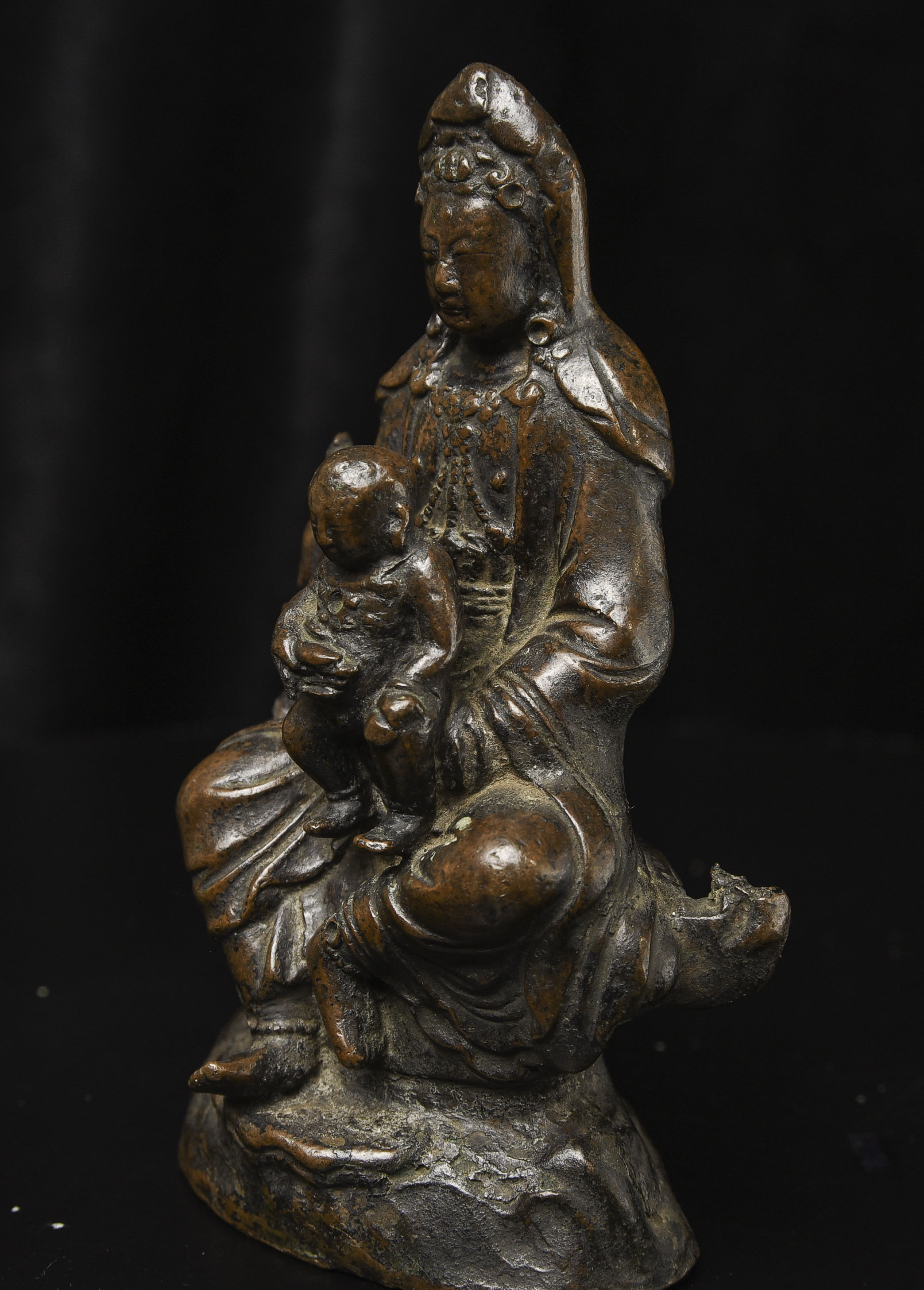 18thC Bronze Quanyin with Baby Buddha. Beautifully sculpted, cast, and finished. The face is exceptional. The way patina has developed makes it even more beautiful. ( 4.75"H x 3"W x 2.75"D ) - 2.29lbs/1.040kg