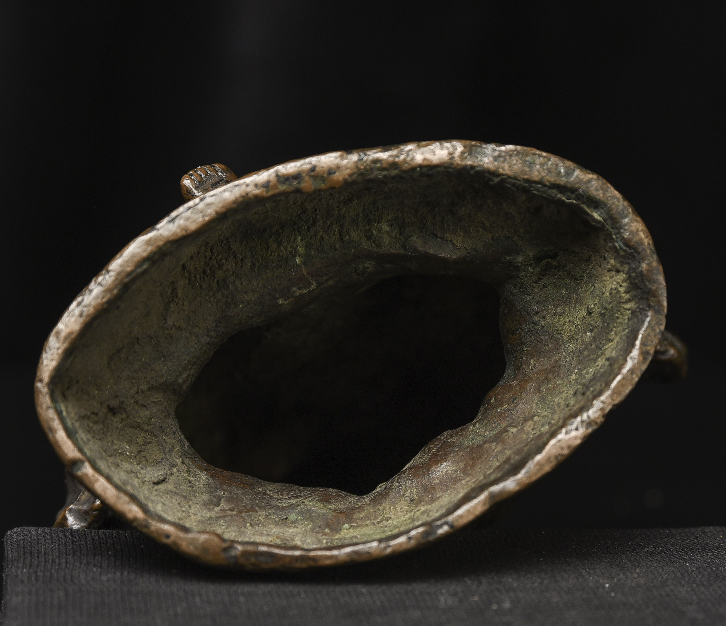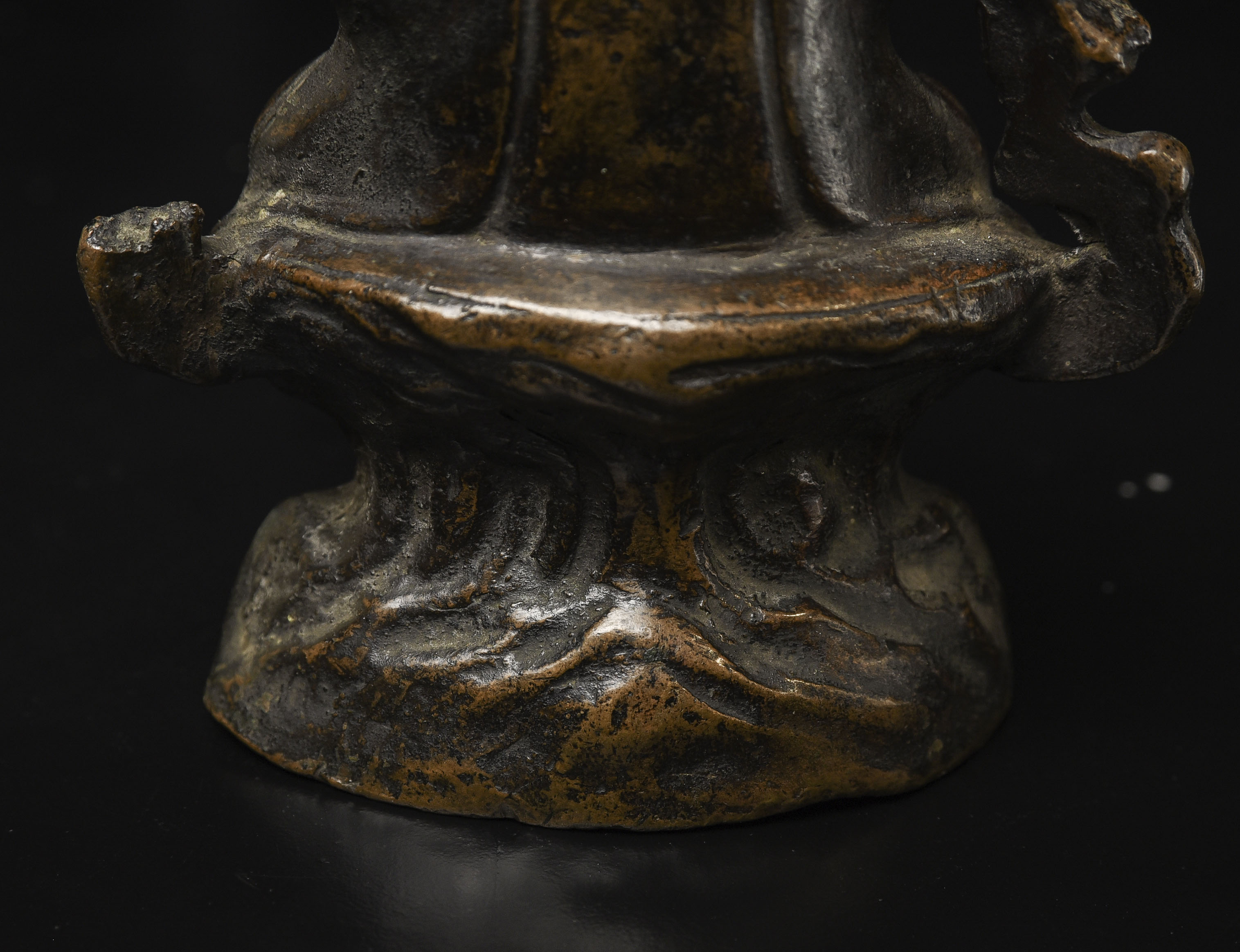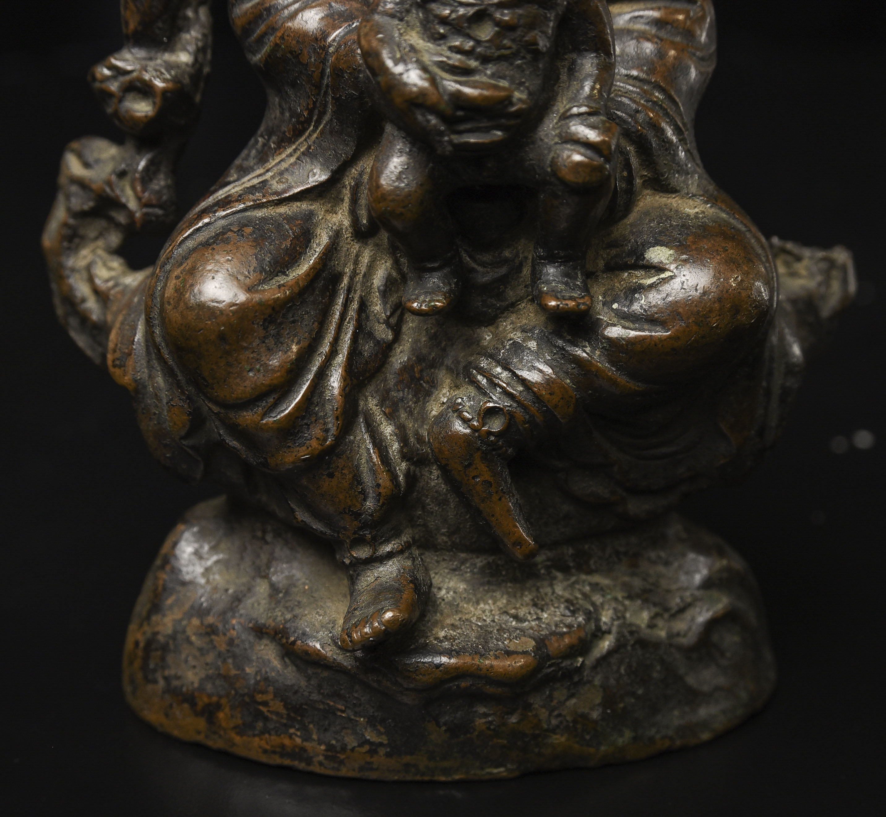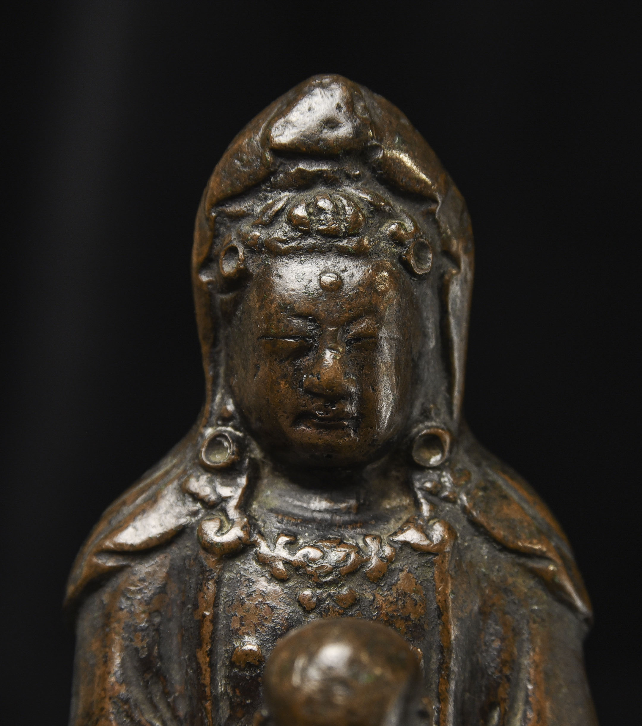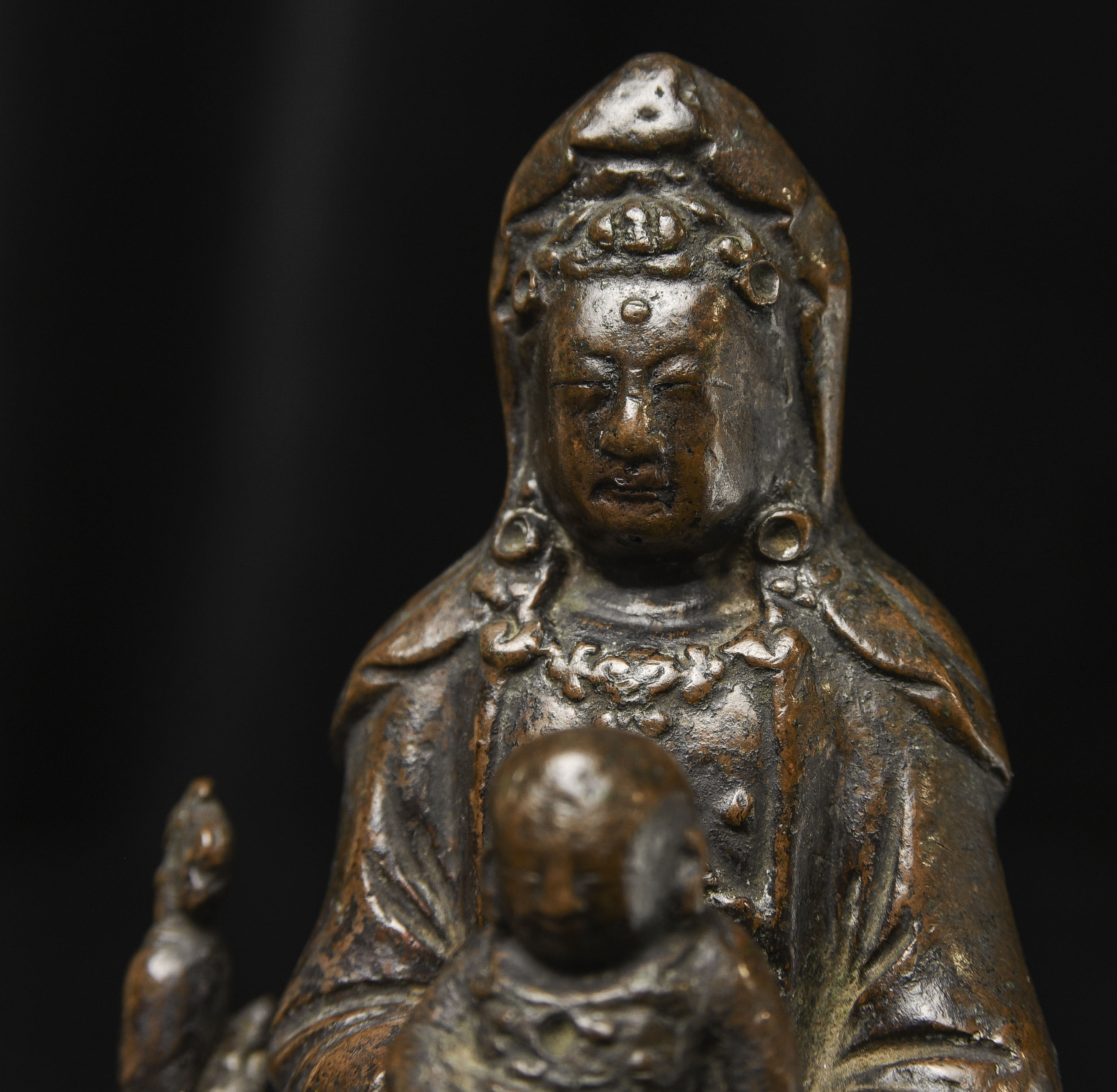 18thC Bronze Quanyin with Baby Buddha. Beautifully sculpted, cast, and finished. The face is exceptional. The way patina has developed makes it even more beautiful. ( 4.75"H x 3"W x 2.75"D ) - 2.29lbs/1.040kg