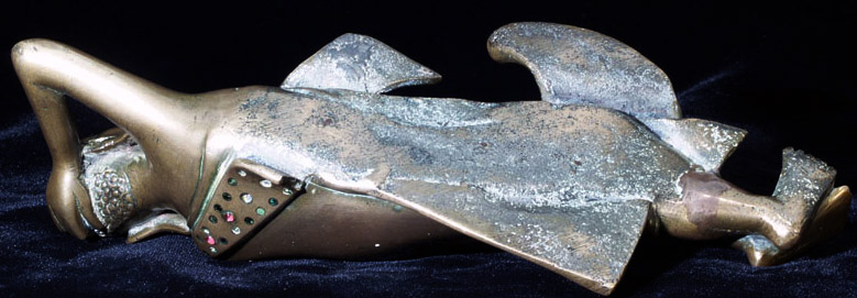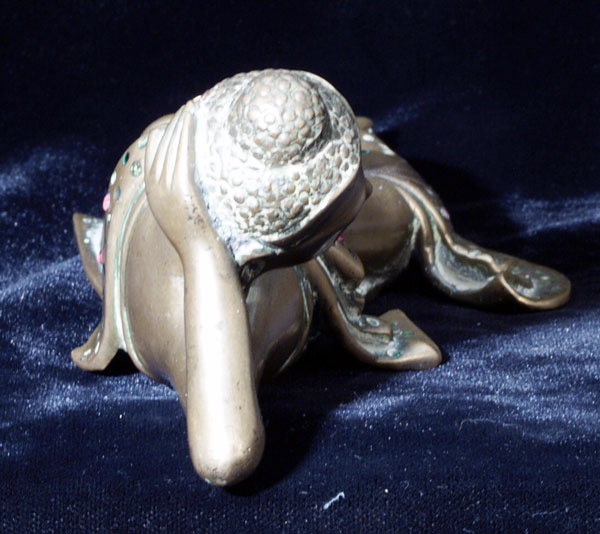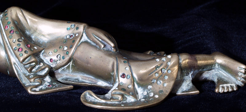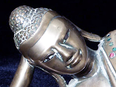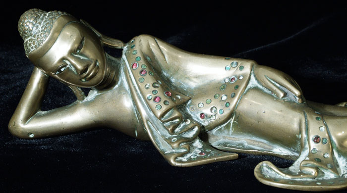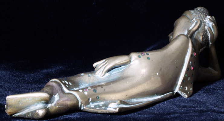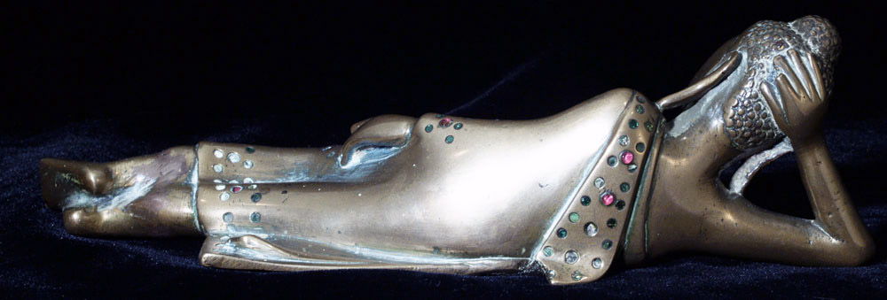 This is a unique solid cast early 19thC Mandalay reclining Buddha- in 20 years of collecting SE Asian bronzes and studying every book on them English I could get my hands on, it is the only finely cast example of its type I have seen. It was hard to capture the golden buttery soft surface and the very high quality of the bronze (note: the white you see is the remains of an old cleaning- it can be removed, but I have not attempted to do so). The flow of the robes and the over all composition of the piece make him all come together to make this a beautiful sculpture. The red stones remaining look to be authentic low grade rubies, and the green bits are decorative mirror-like pieces were used at that time to emulate green gems. He is a nice size at 9 inches long by 2.5 inches tall at the head. He is substantial at over 30 ounces. A personal favorite.