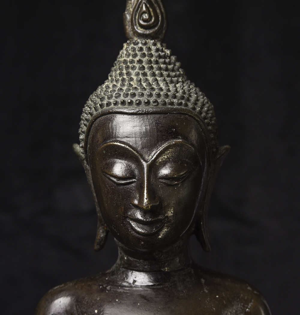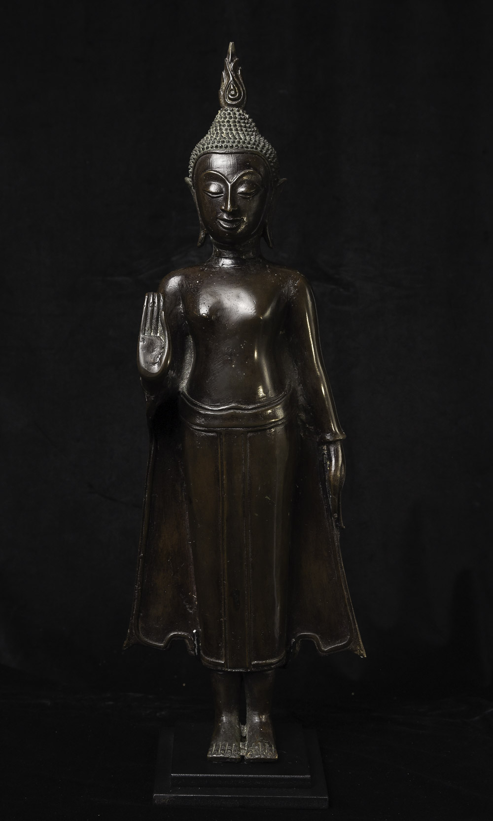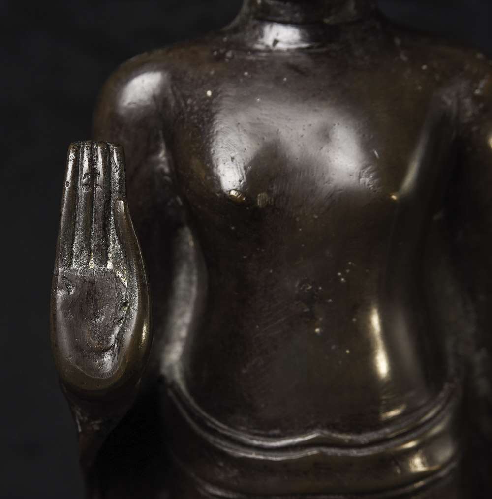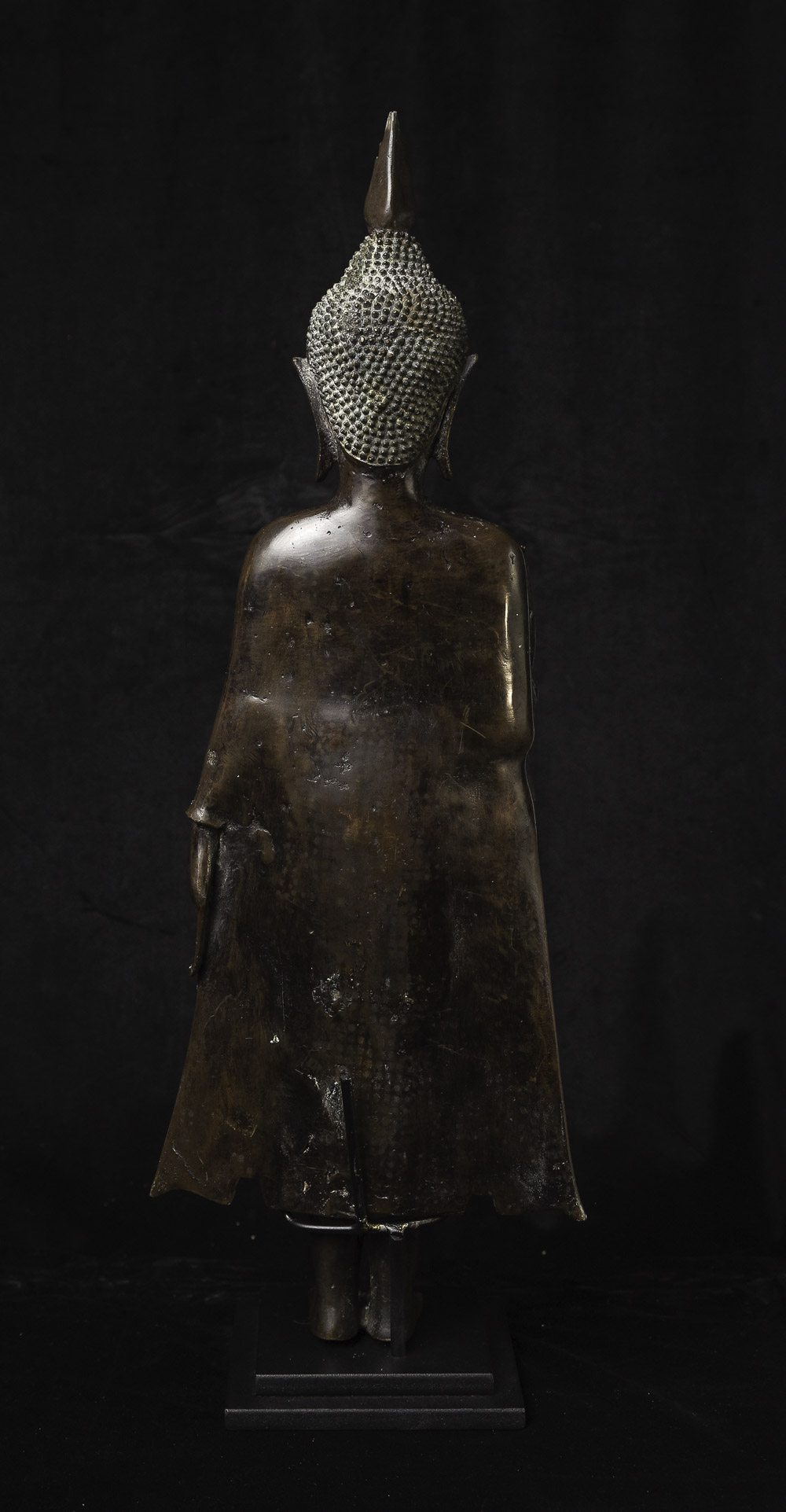 Well cast 17/19thC Northern Thai Standing Bronze Buddha. Stands fine with its back against a wall or other surface. A nice example of its type. Has a custom base. (20.75"H x 7.5"W X 3.875"D ) - 10lbs / 4.53kg - ( Base: 4.5lbs / 2kg - .75"H )