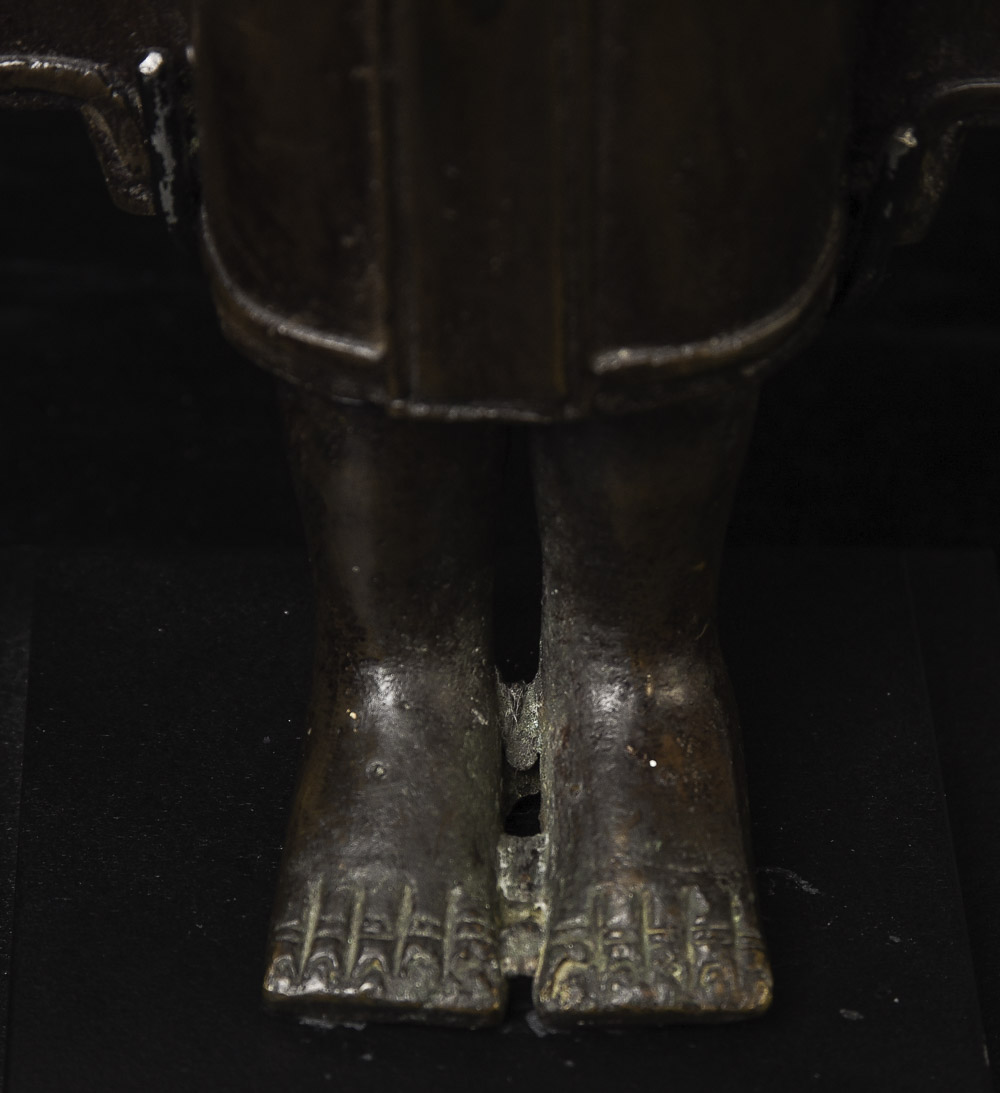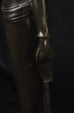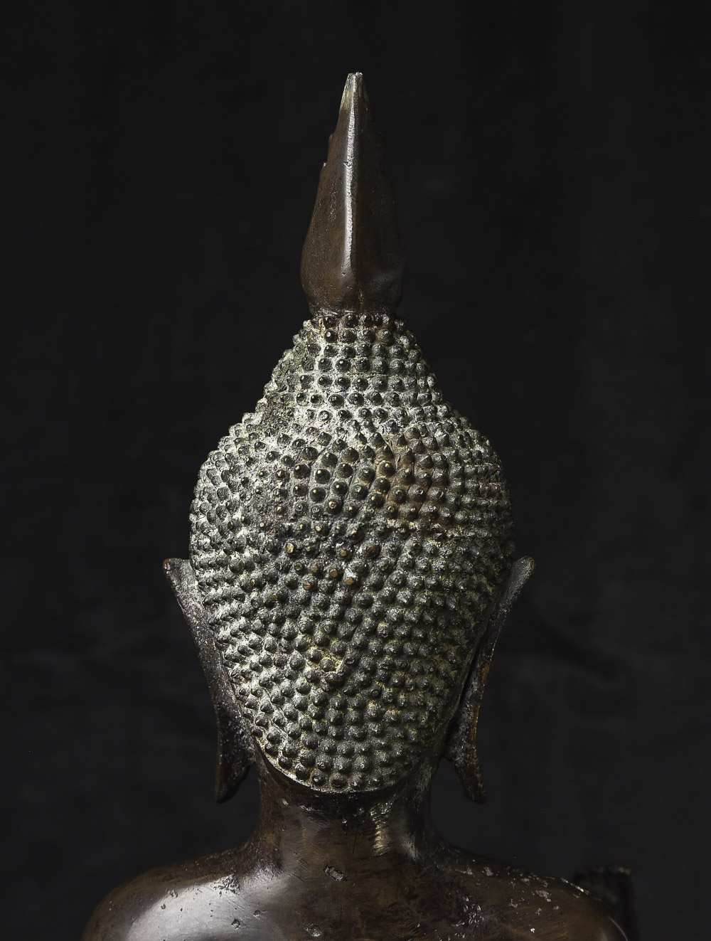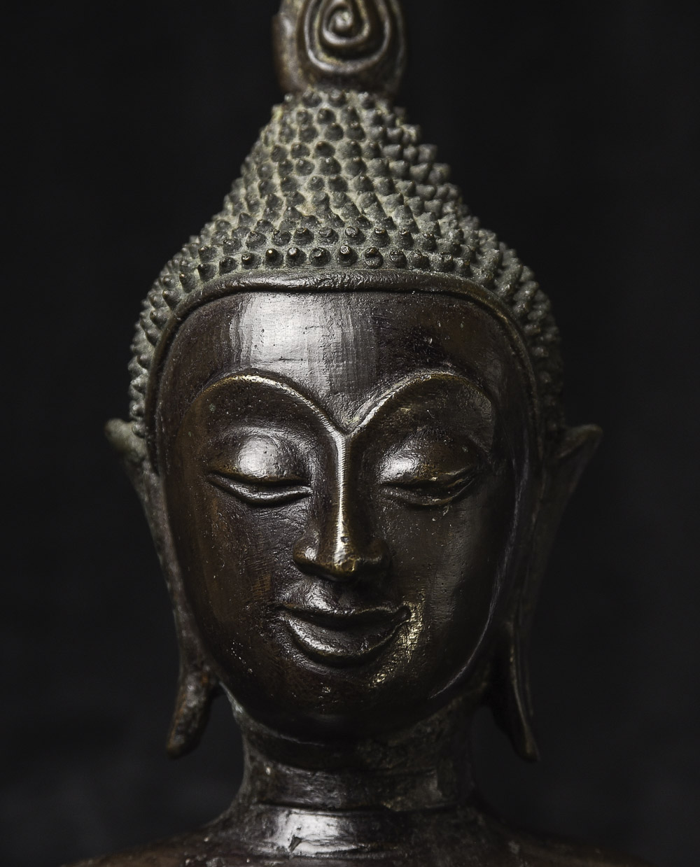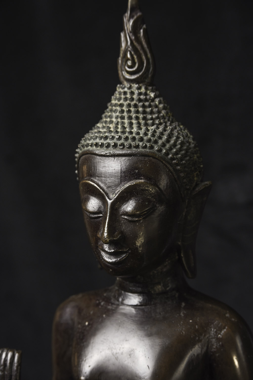 Well cast 17/19thC Northern Thai Standing Bronze Buddha. Stands fine with its back against a wall or other surface. A nice example of its type. Has a custom base. (20.75"H x 7.5"W X 3.875"D ) - 10lbs / 4.53kg - ( Base: 4.5lbs / 2kg - .75"H )